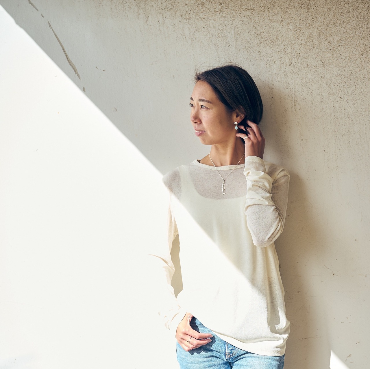 縦型シルエットがしっかり落ちて、首元のチェーンがV字を作ってくれるので首元がスッキリ美しく見えます。