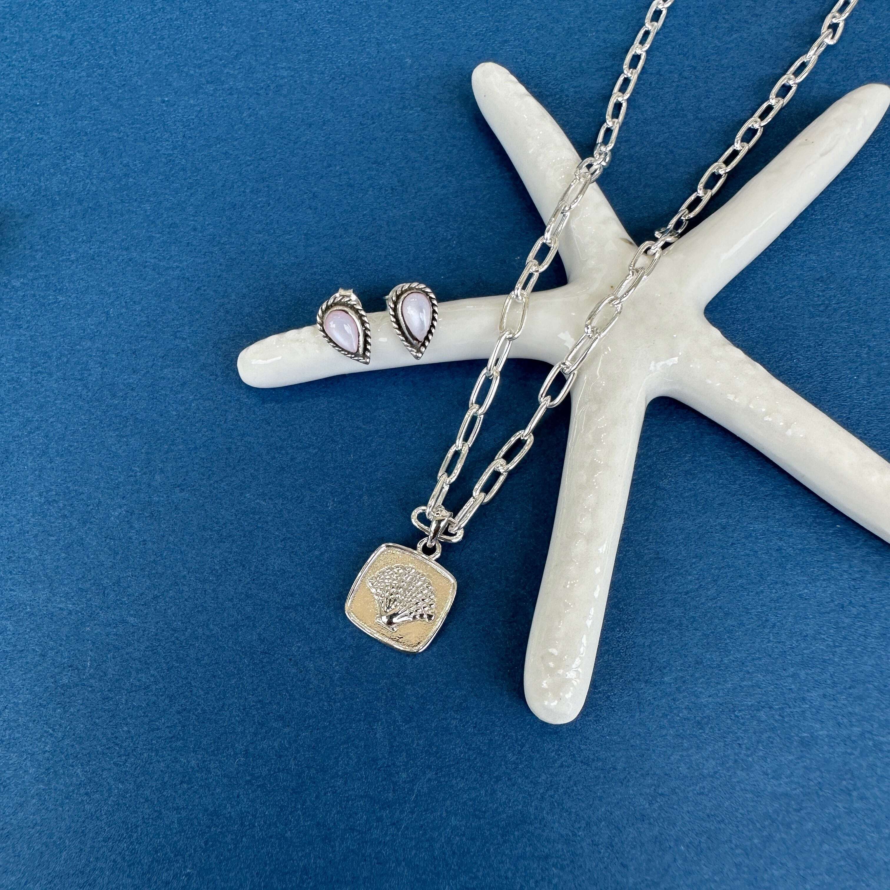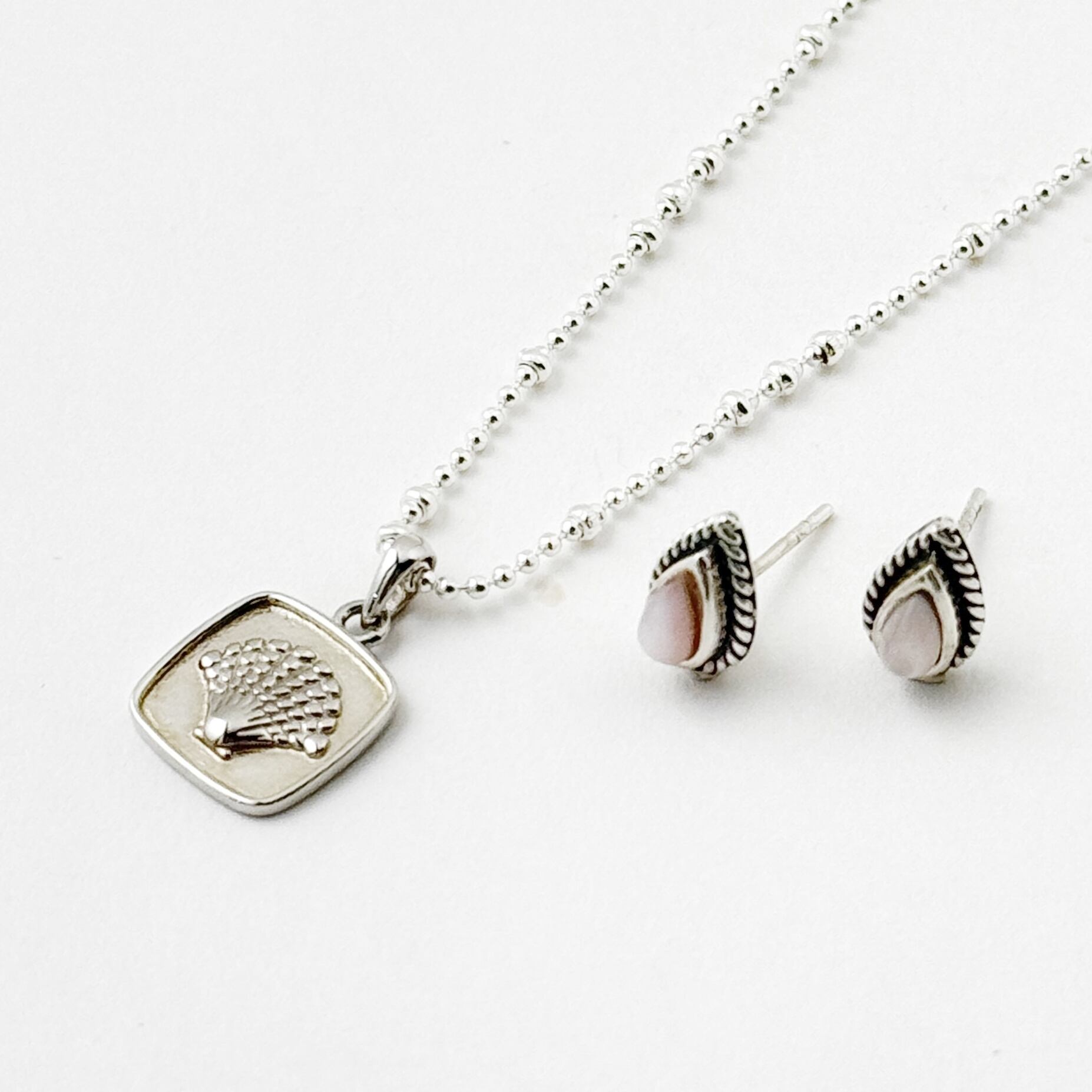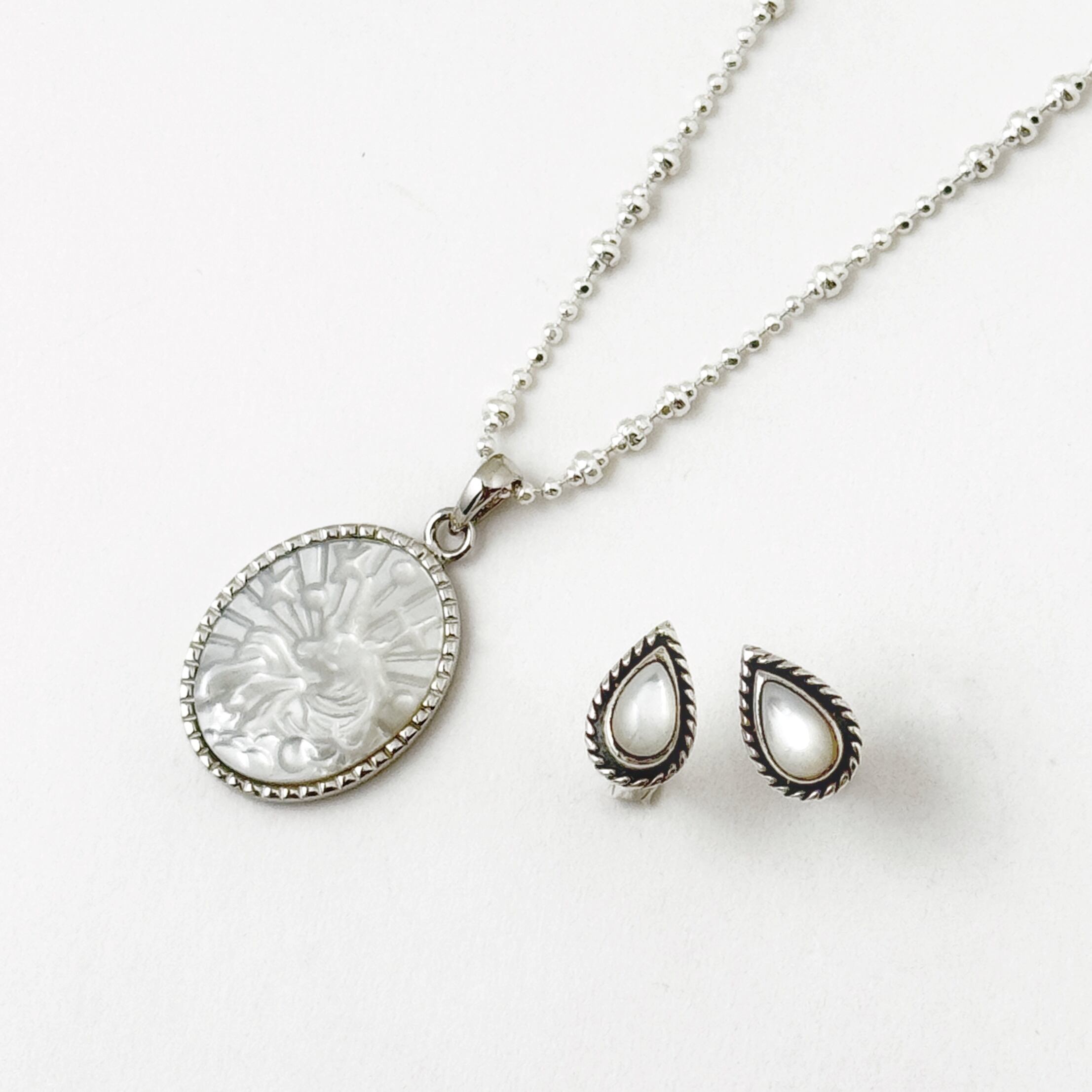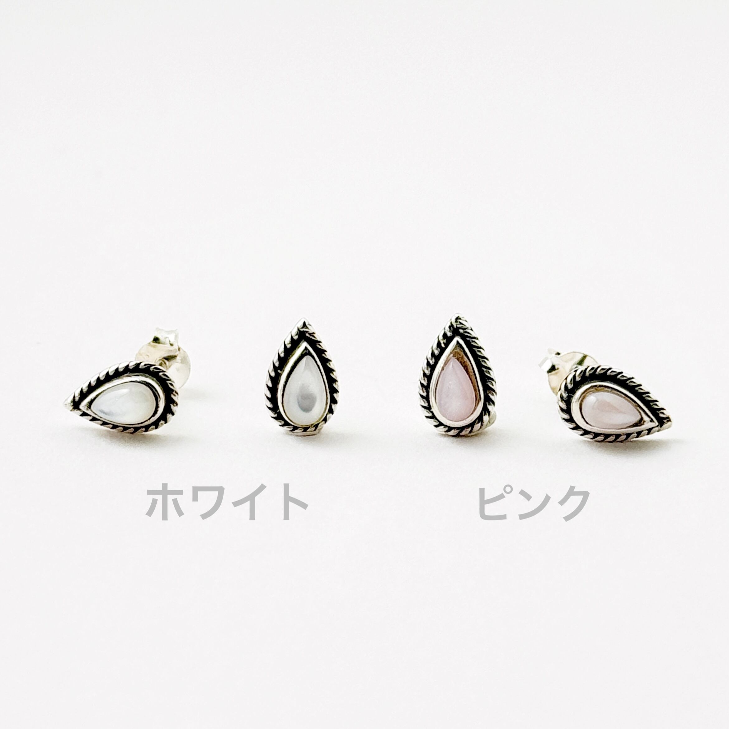 ペイズリーのようなシェイプのシェルに、ロープワークを施したシルバーが縁取りしている他に見かけないデザインのピアスです。