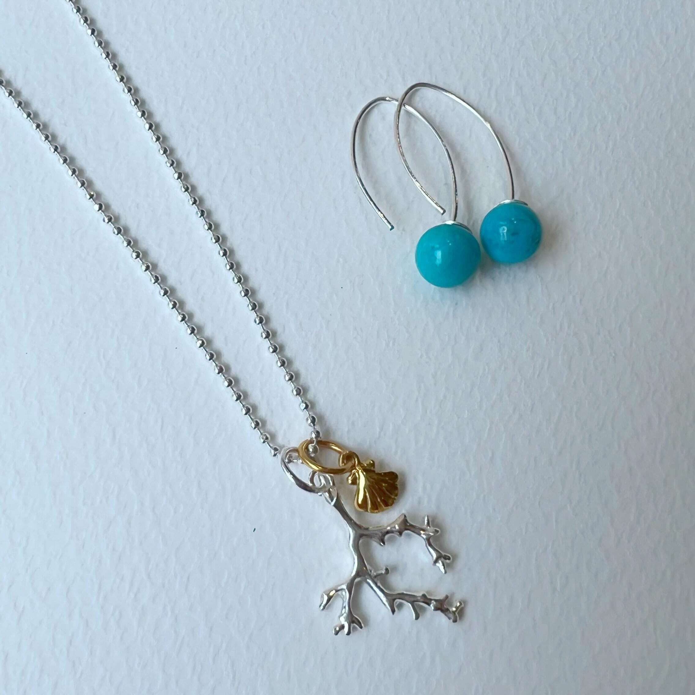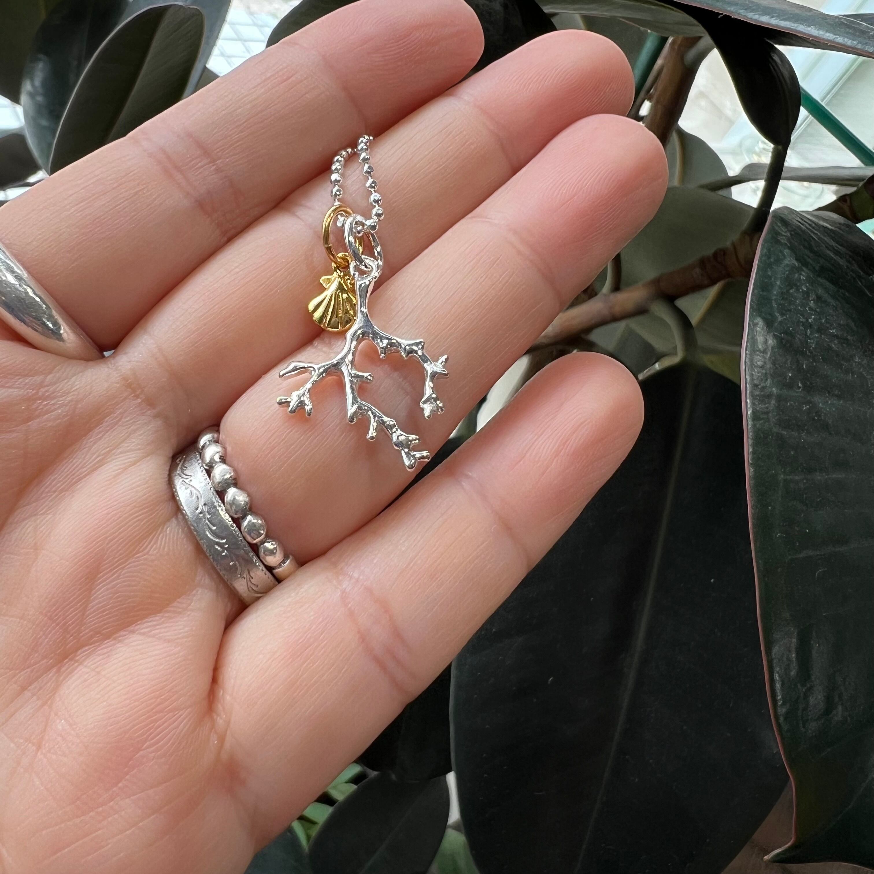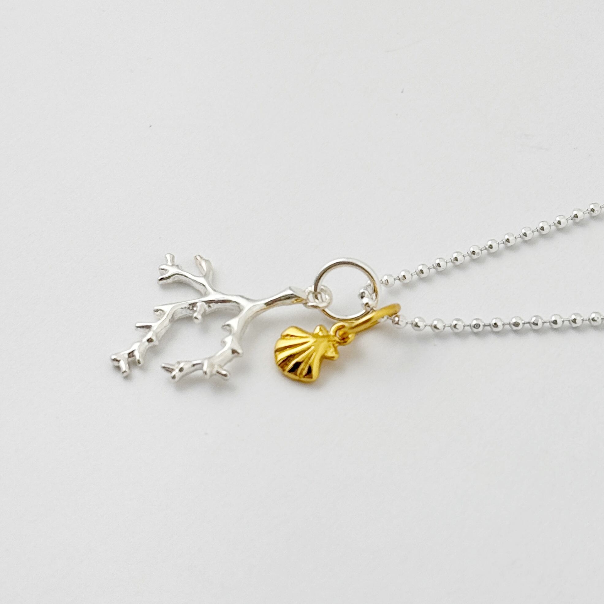 先端部分まで細かくデザインされたサンゴと、Gold Coatingのリトルシェルがセットになったネックレスです。マレアオリジナルです。