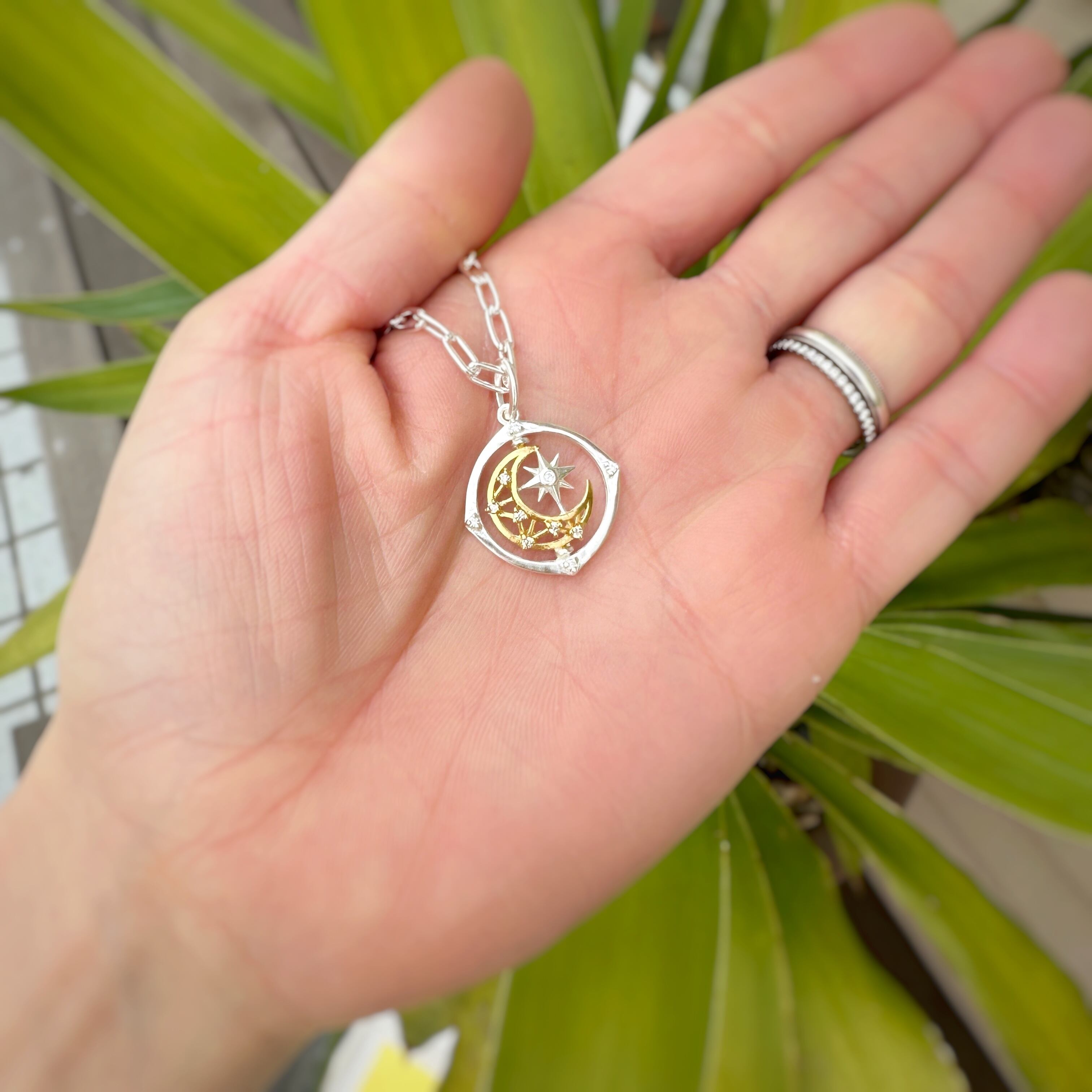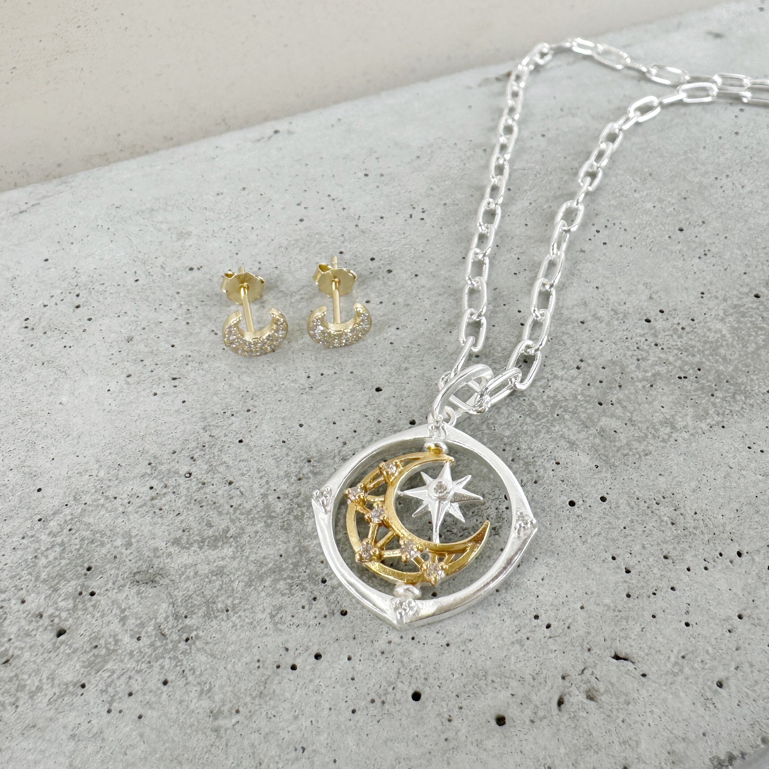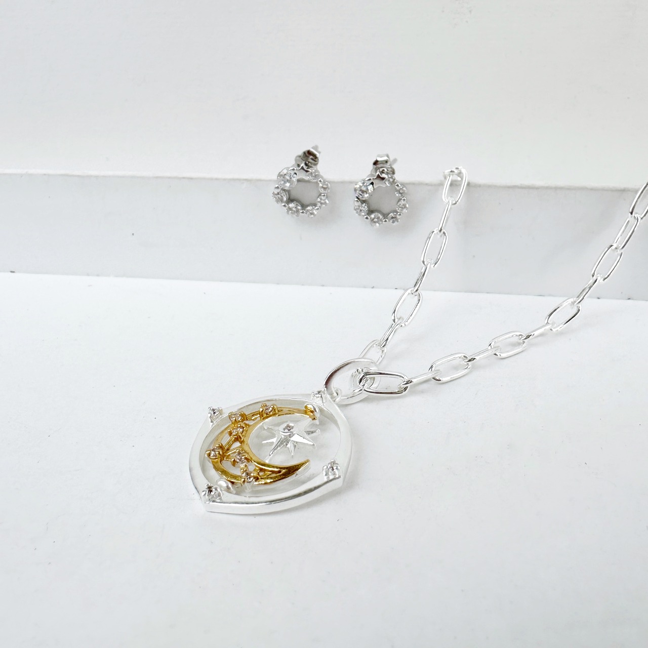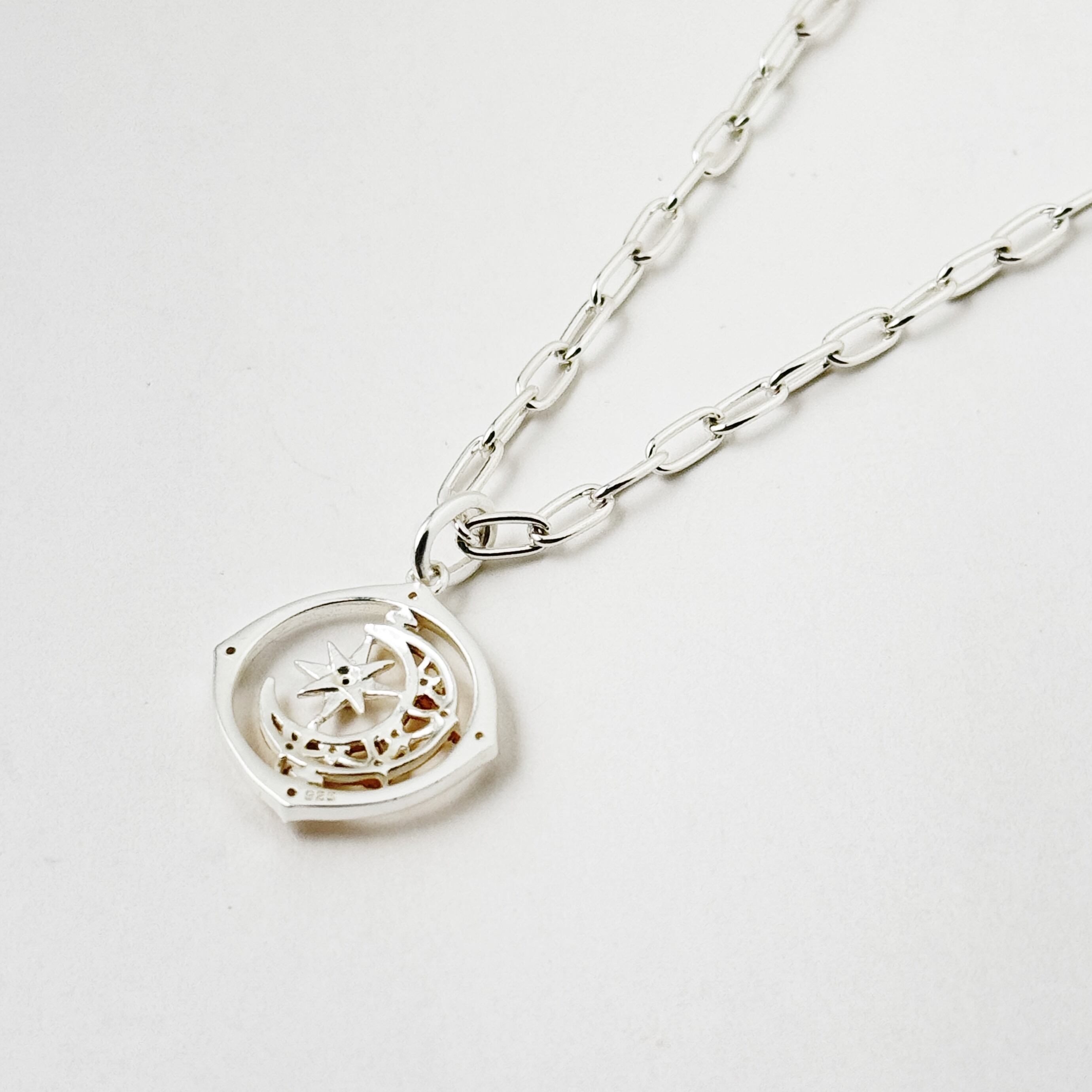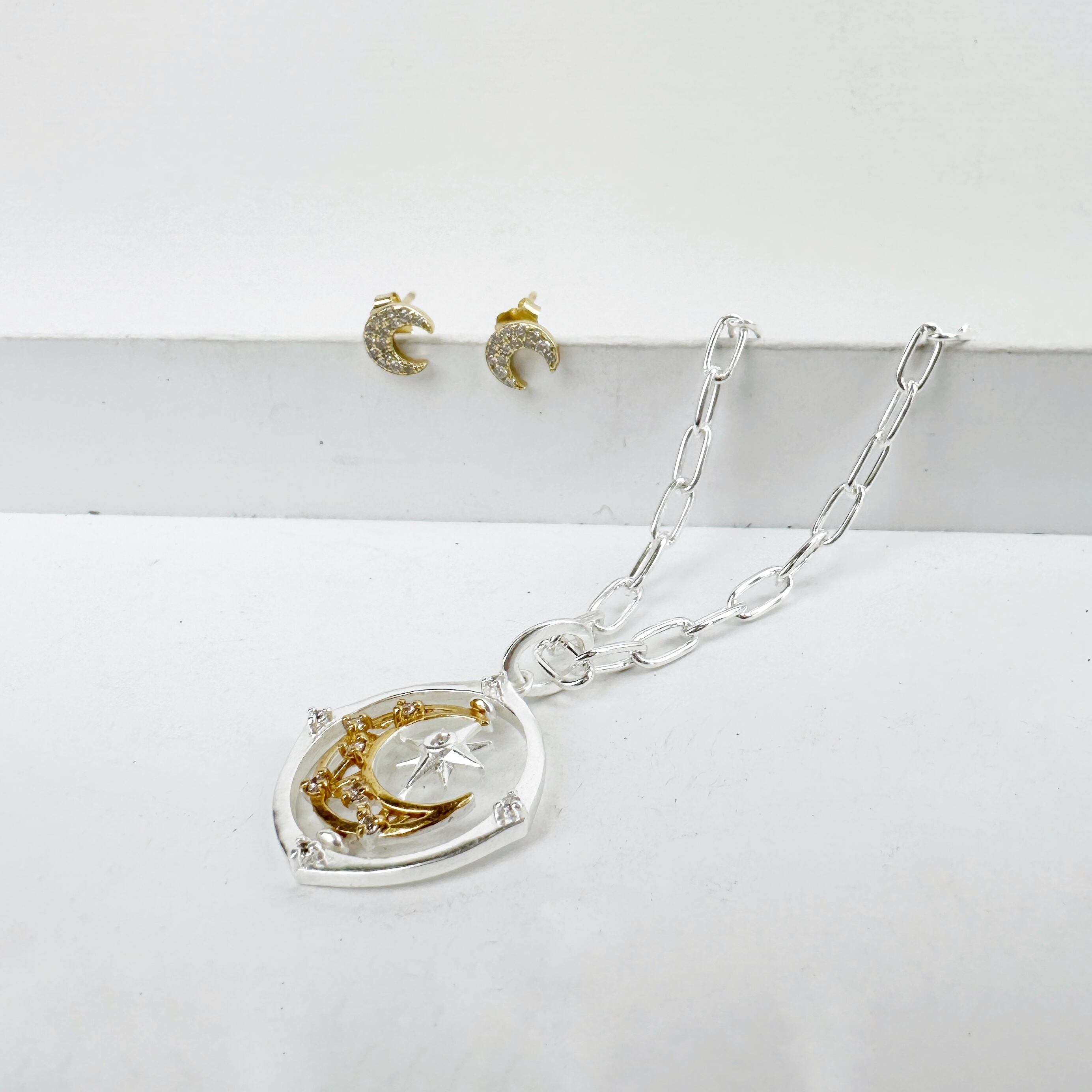 モチーフ化された月と星をかたどったデザインです。女性の守り神と言われている月には小さなジルコニアが6石セットされて静かな輝きをプラスしてくれます。