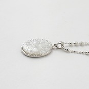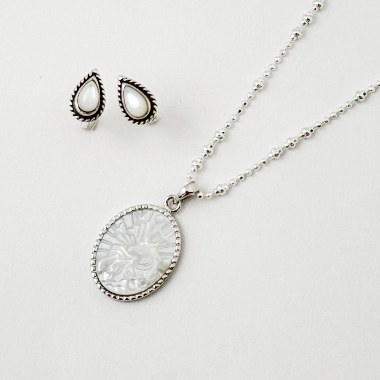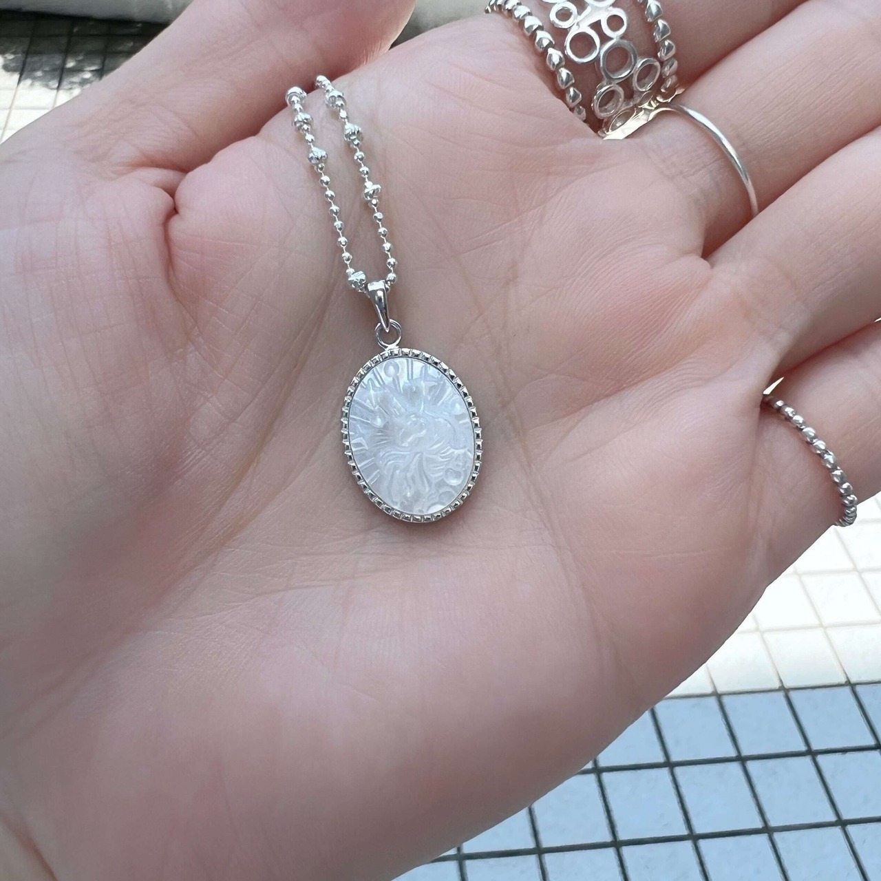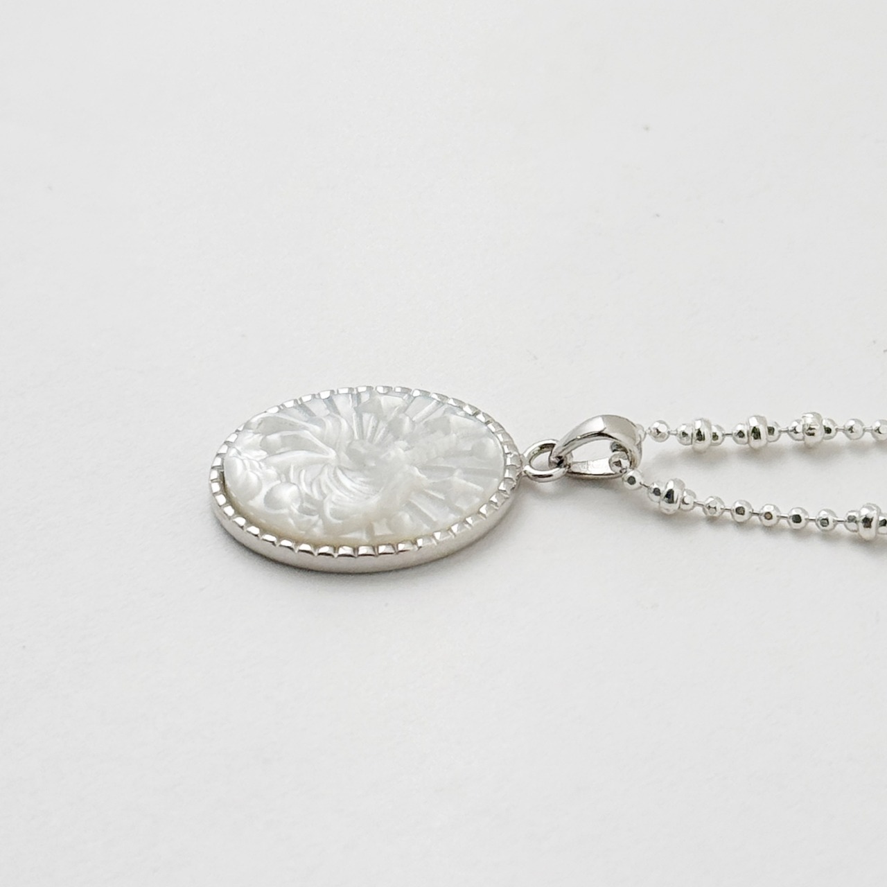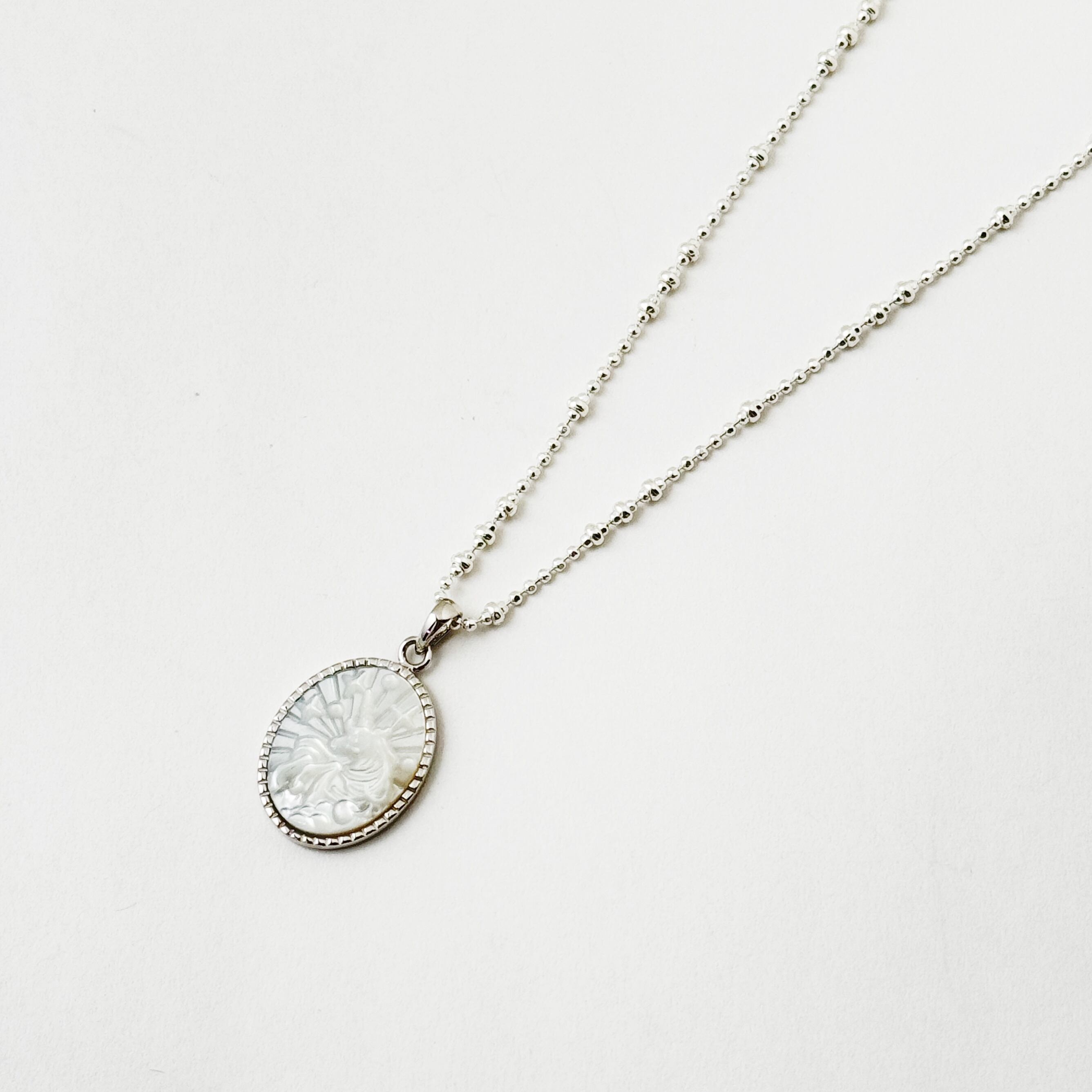 真っ白な白蝶貝を贅沢に使用し、繊細なカービングを施したユニコーンの彫刻が、光によって輝きを放ちます。