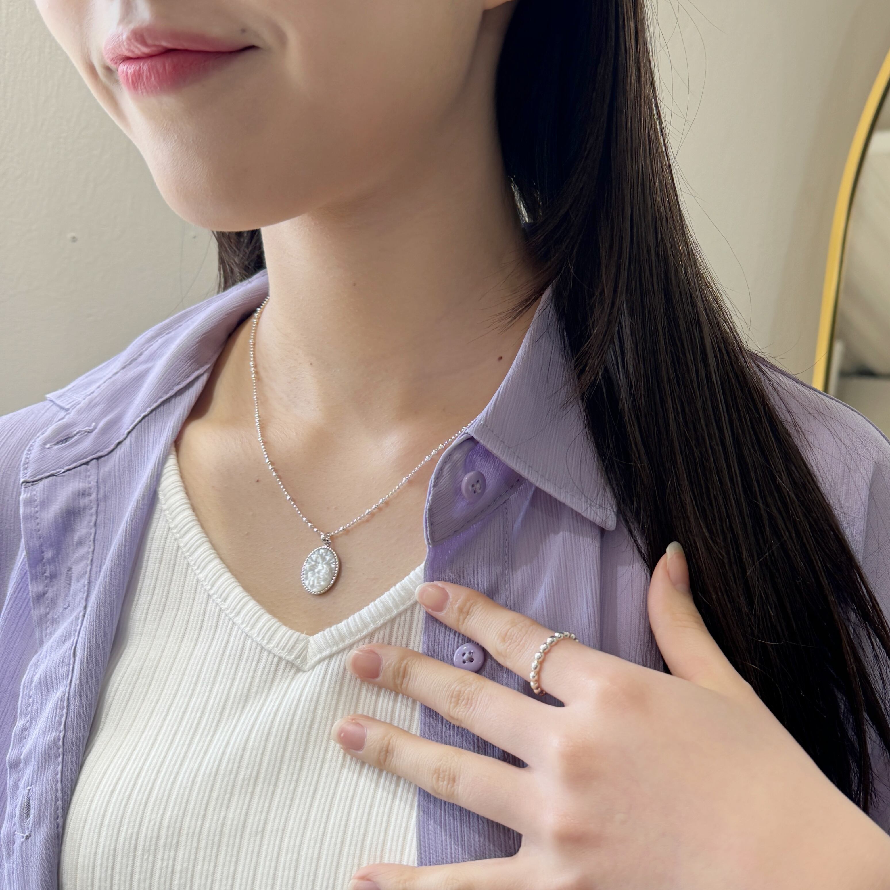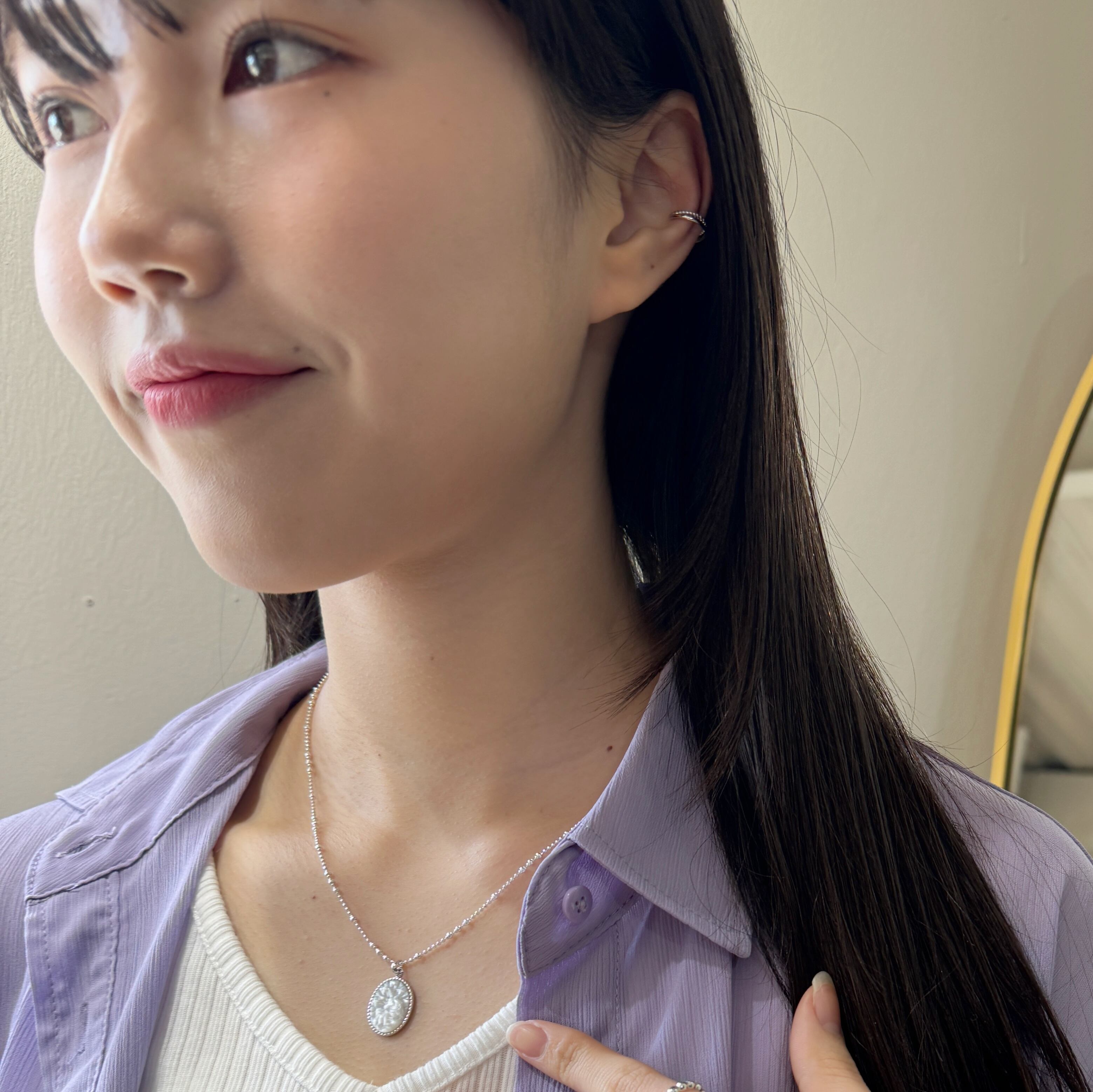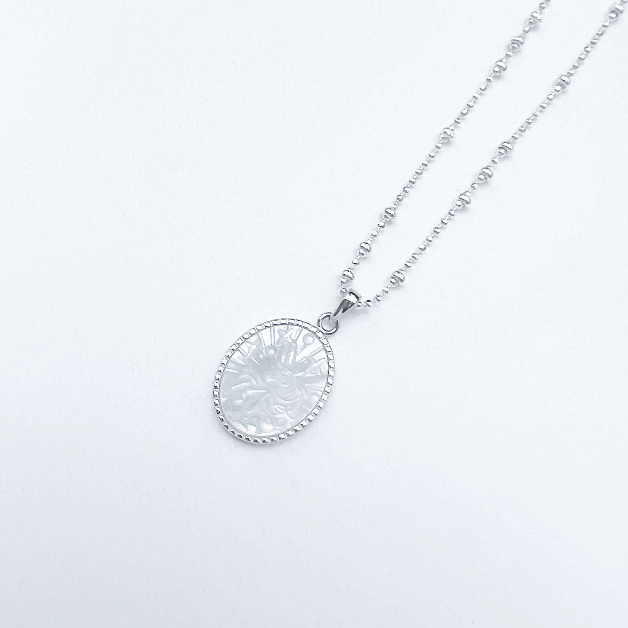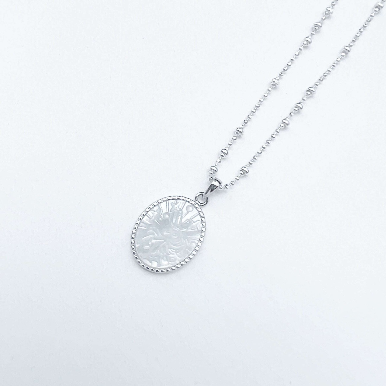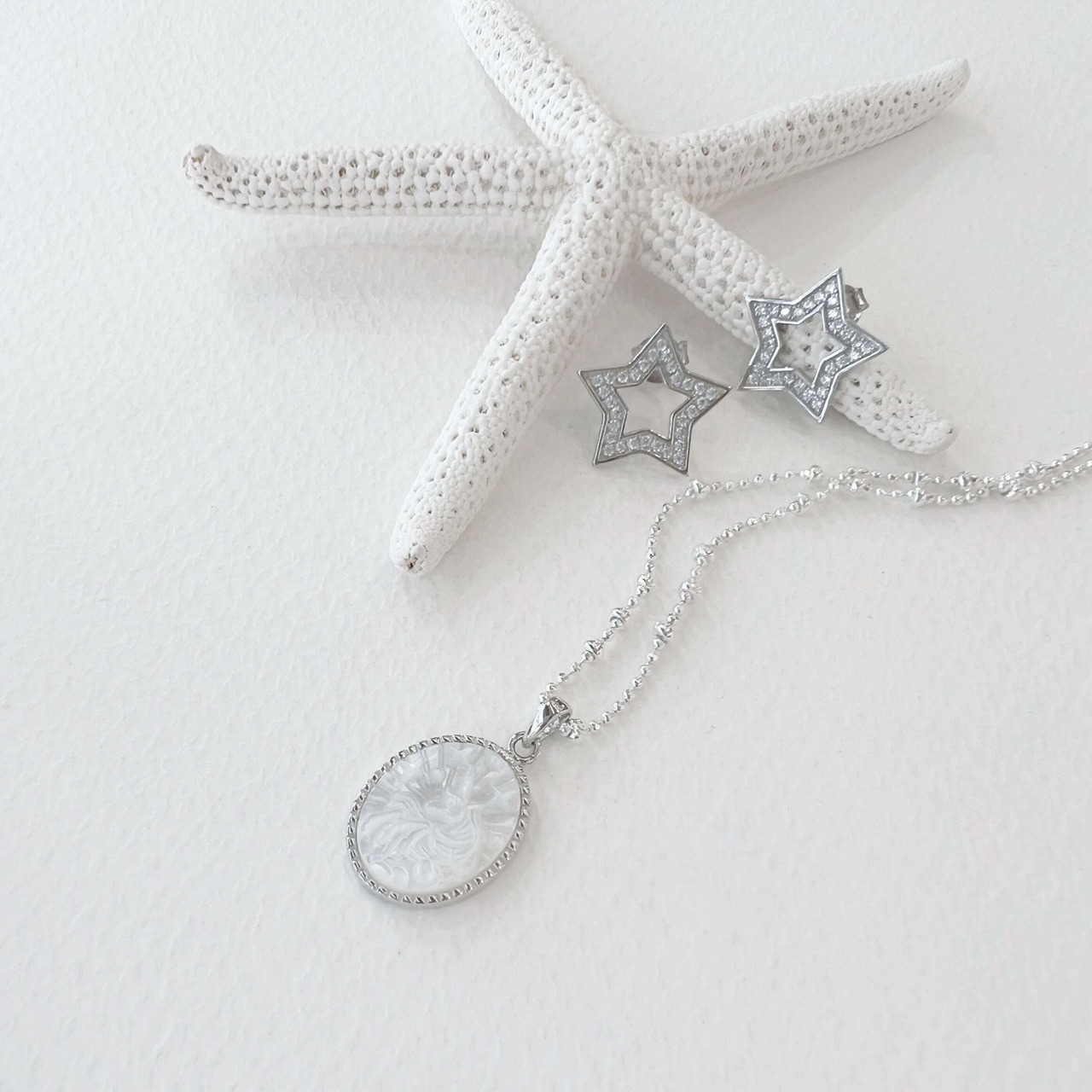 真っ白な白蝶貝を贅沢に使用し、繊細なカービングを施したユニコーンの彫刻が、光によって輝きを放ちます。
