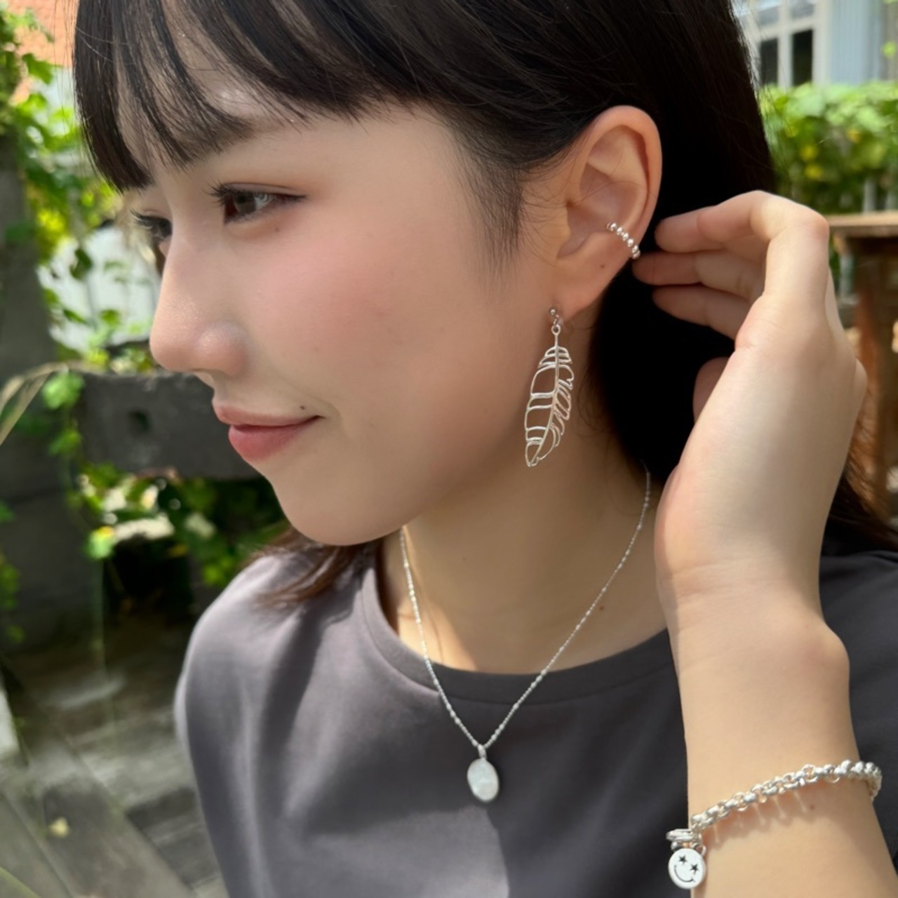 ラインでシルバーモチーフをスッキリと描いているので、カジュアルになりすぎずにつけられます。