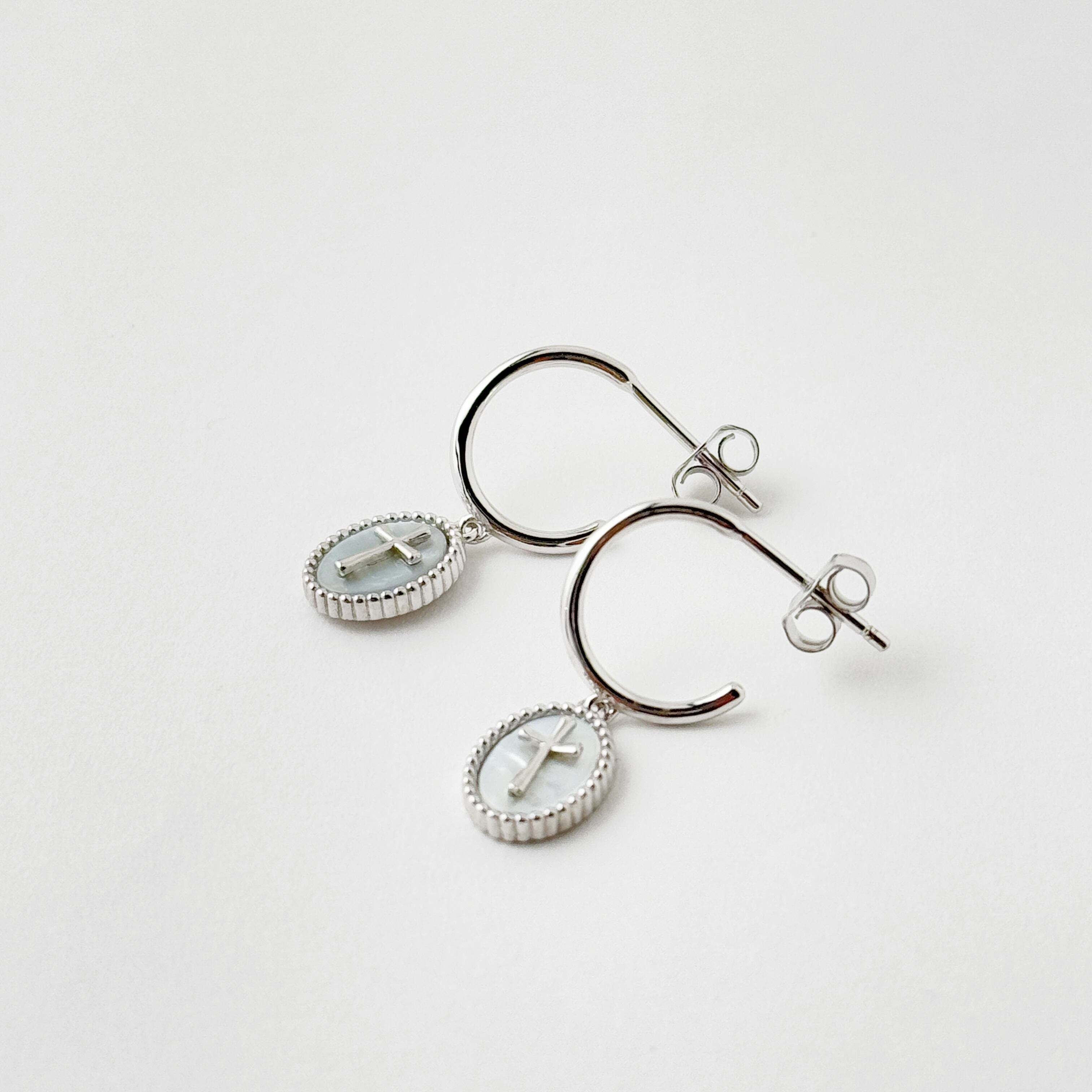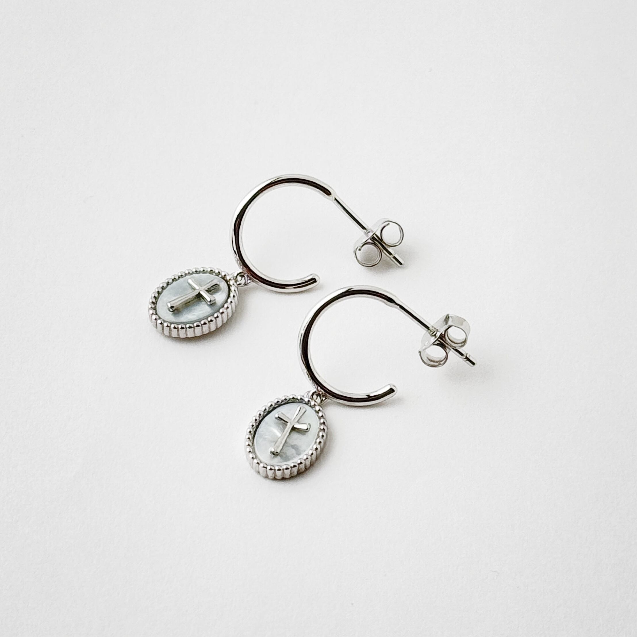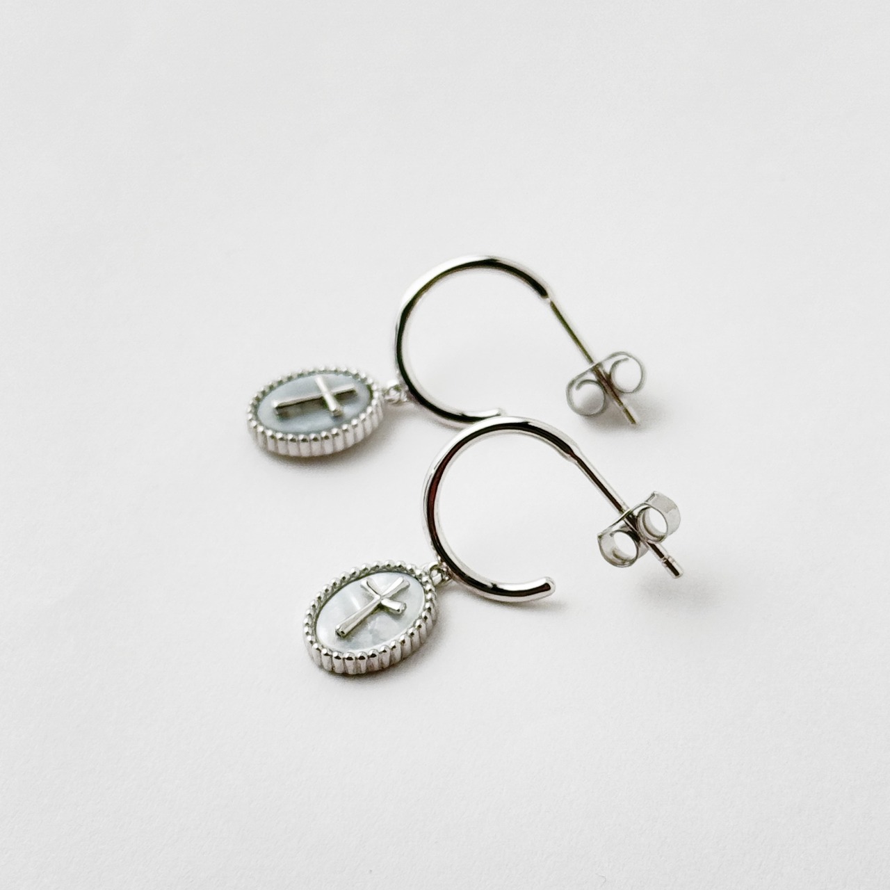 オーバルの台座に白蝶貝、その上に小さなsilver クロスという