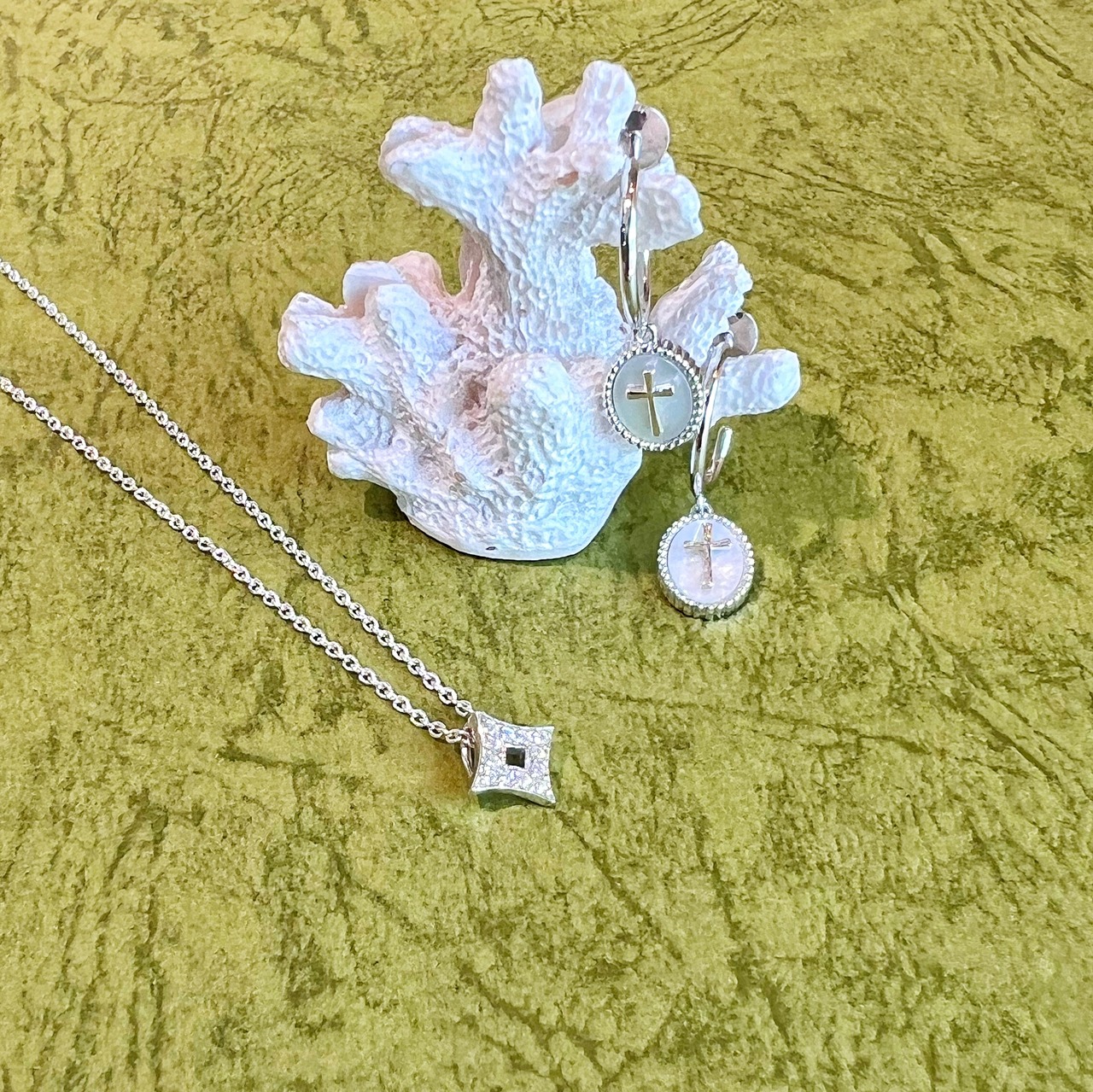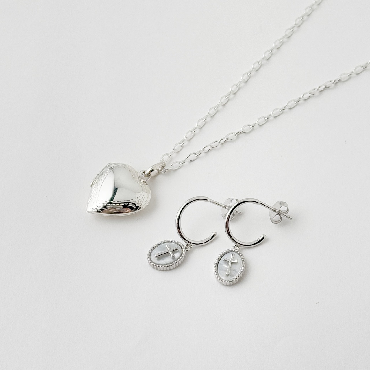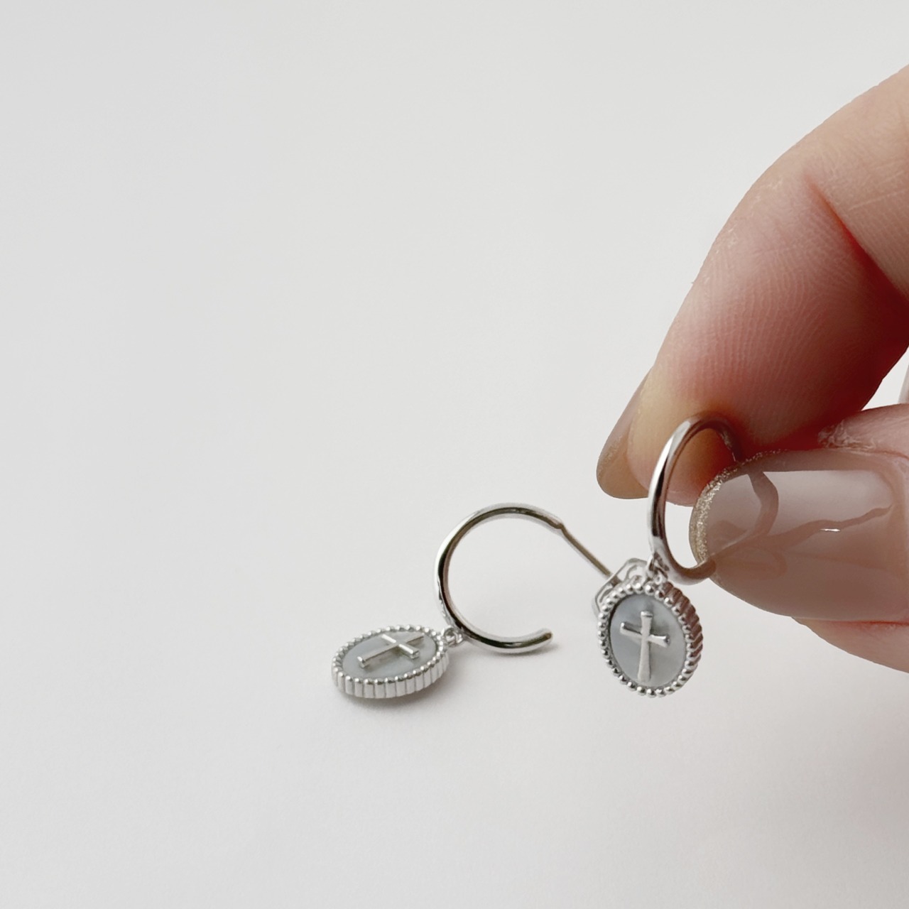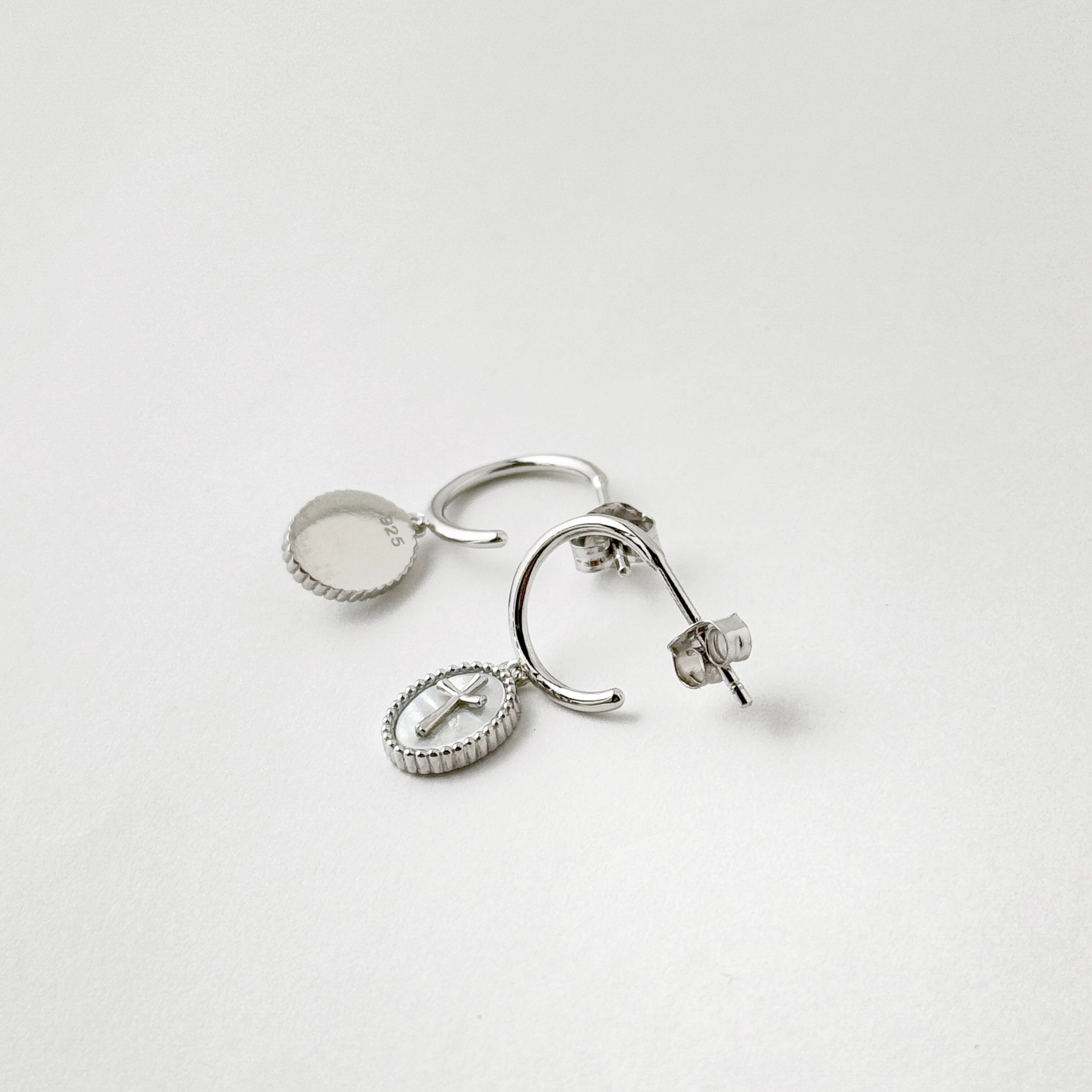 オーバルの台座に白蝶貝、その上に小さなsilver クロスという