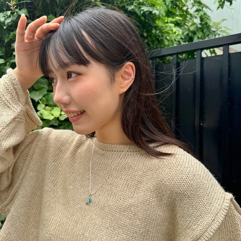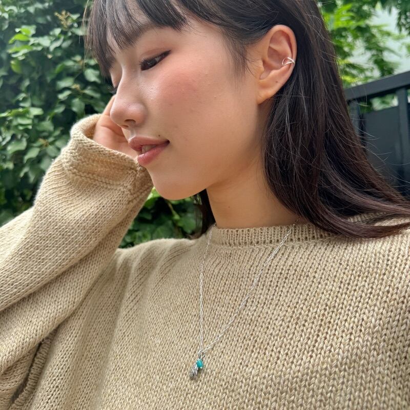 スタイルを選ばないロングアズキチェーンに合わせました。