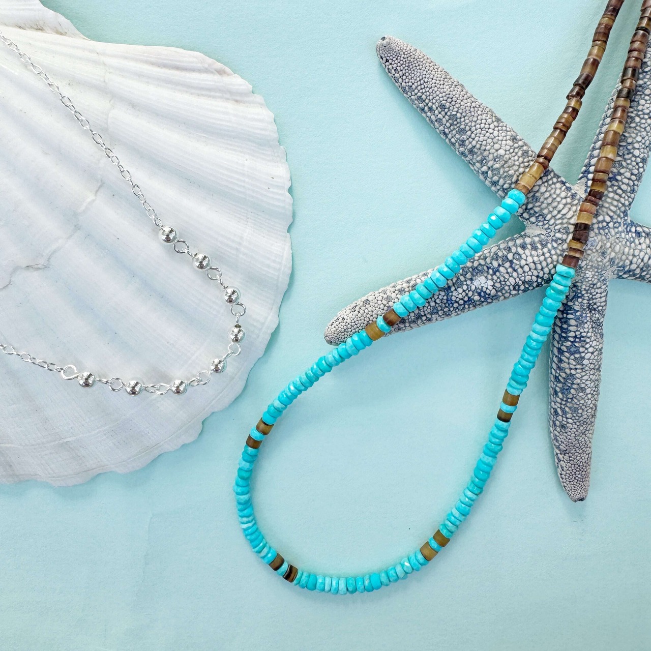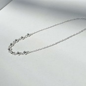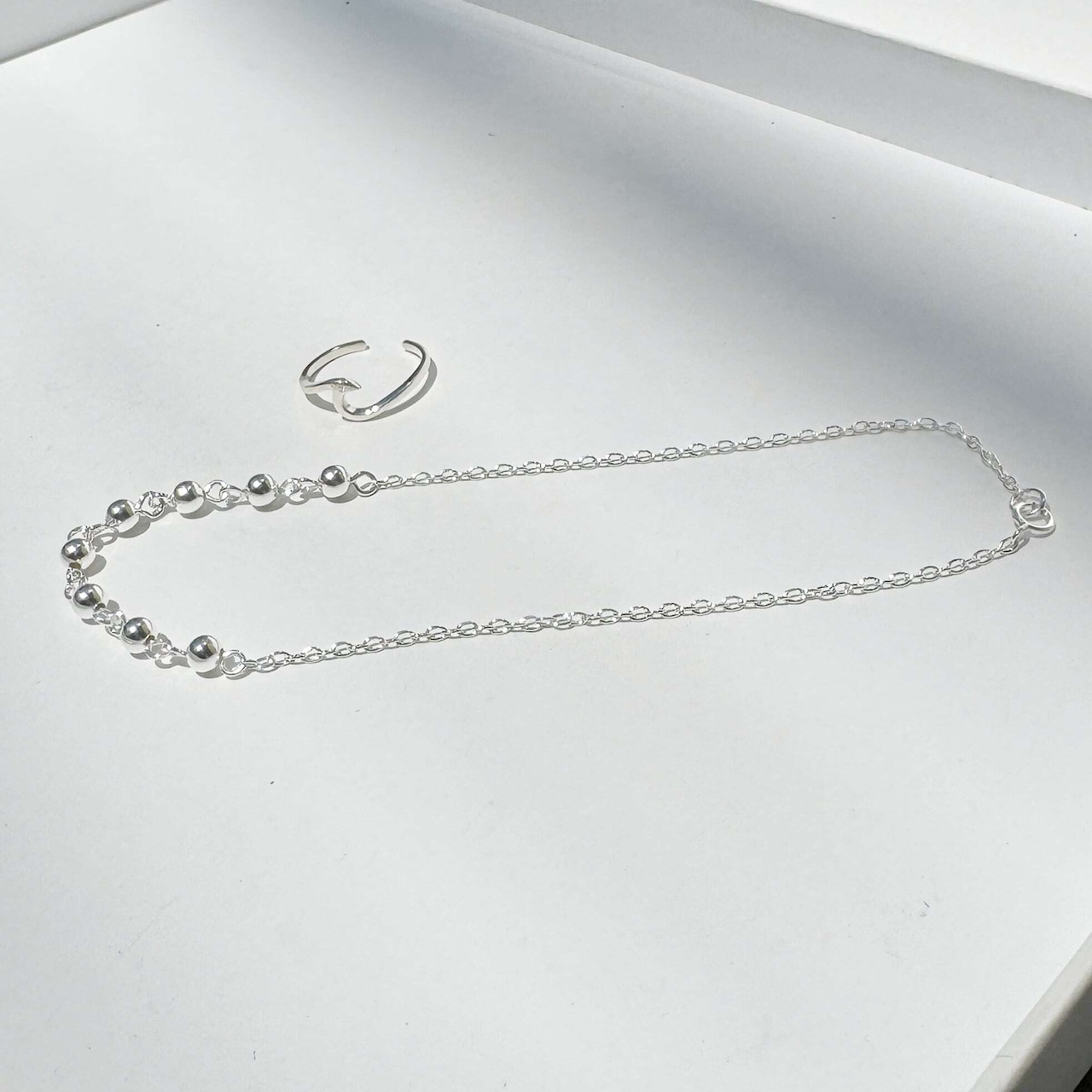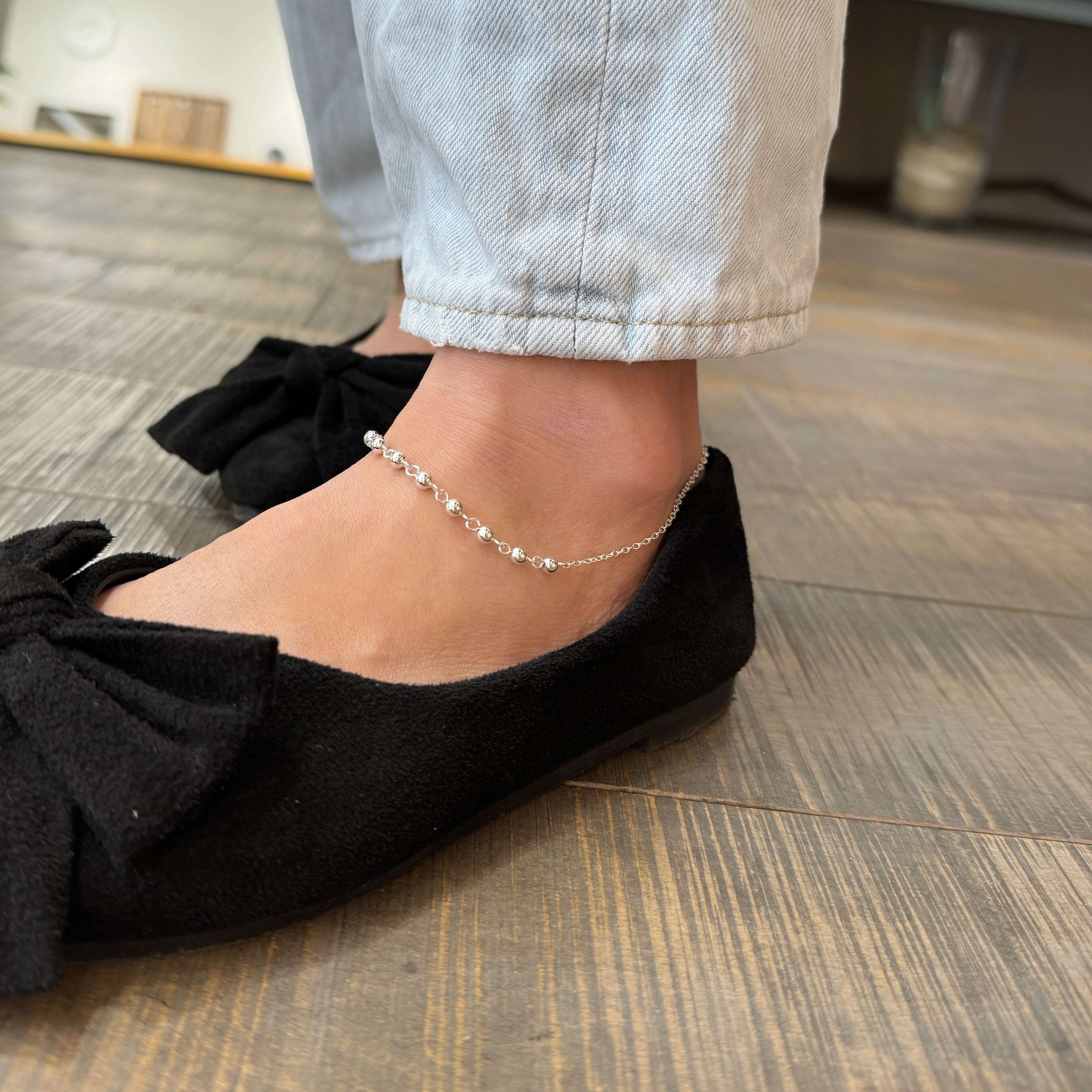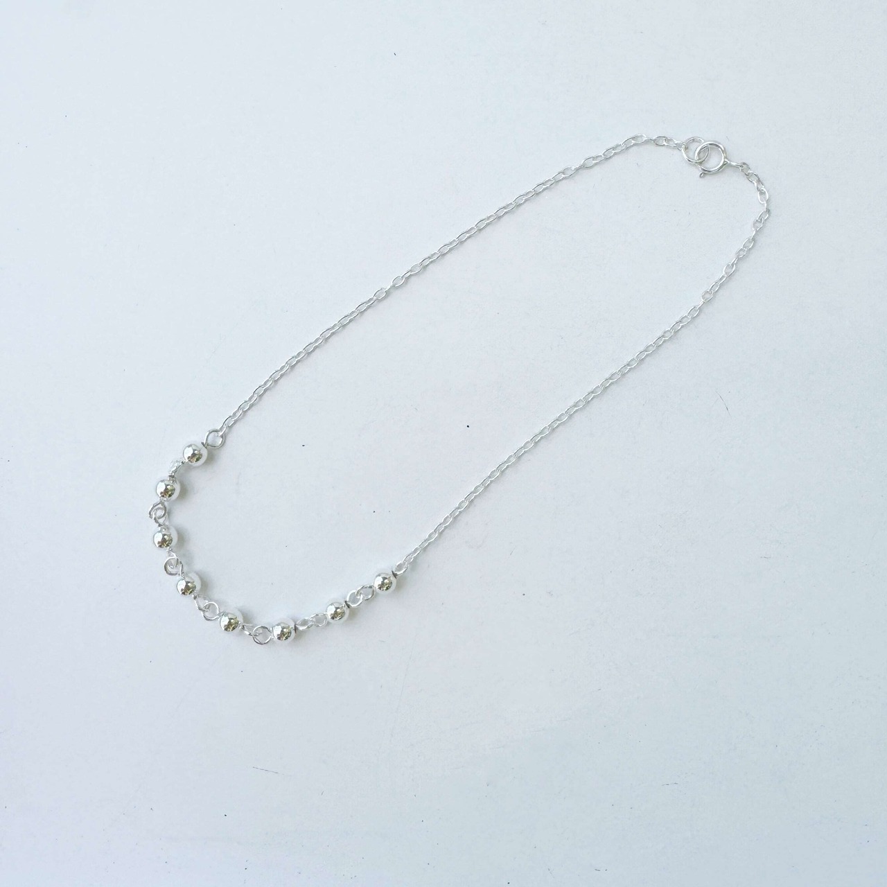 シンプルなあずきチェーンをベースにしたアンクレットに、8つのボールをセンターにセットしてアクセントにしたデザインです。