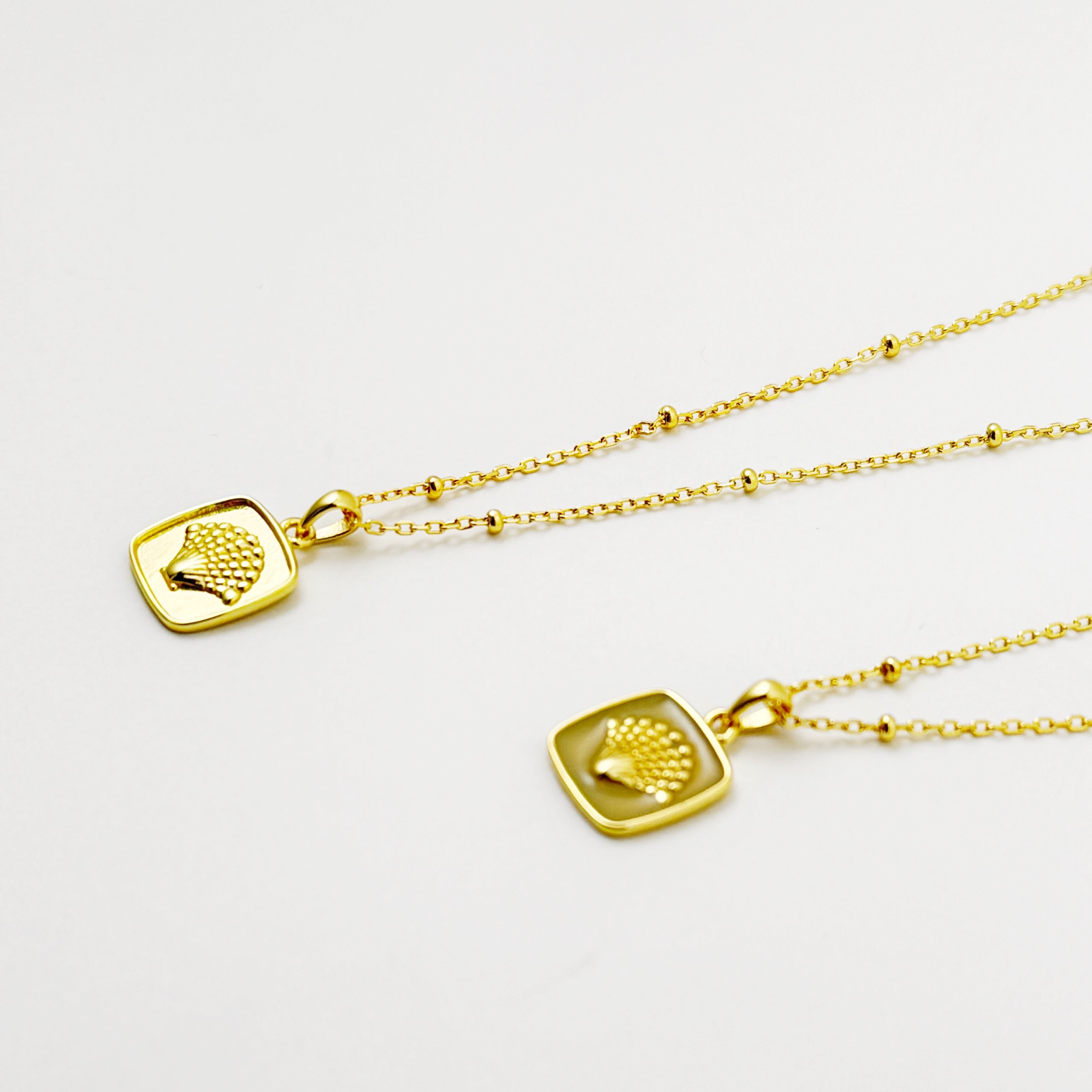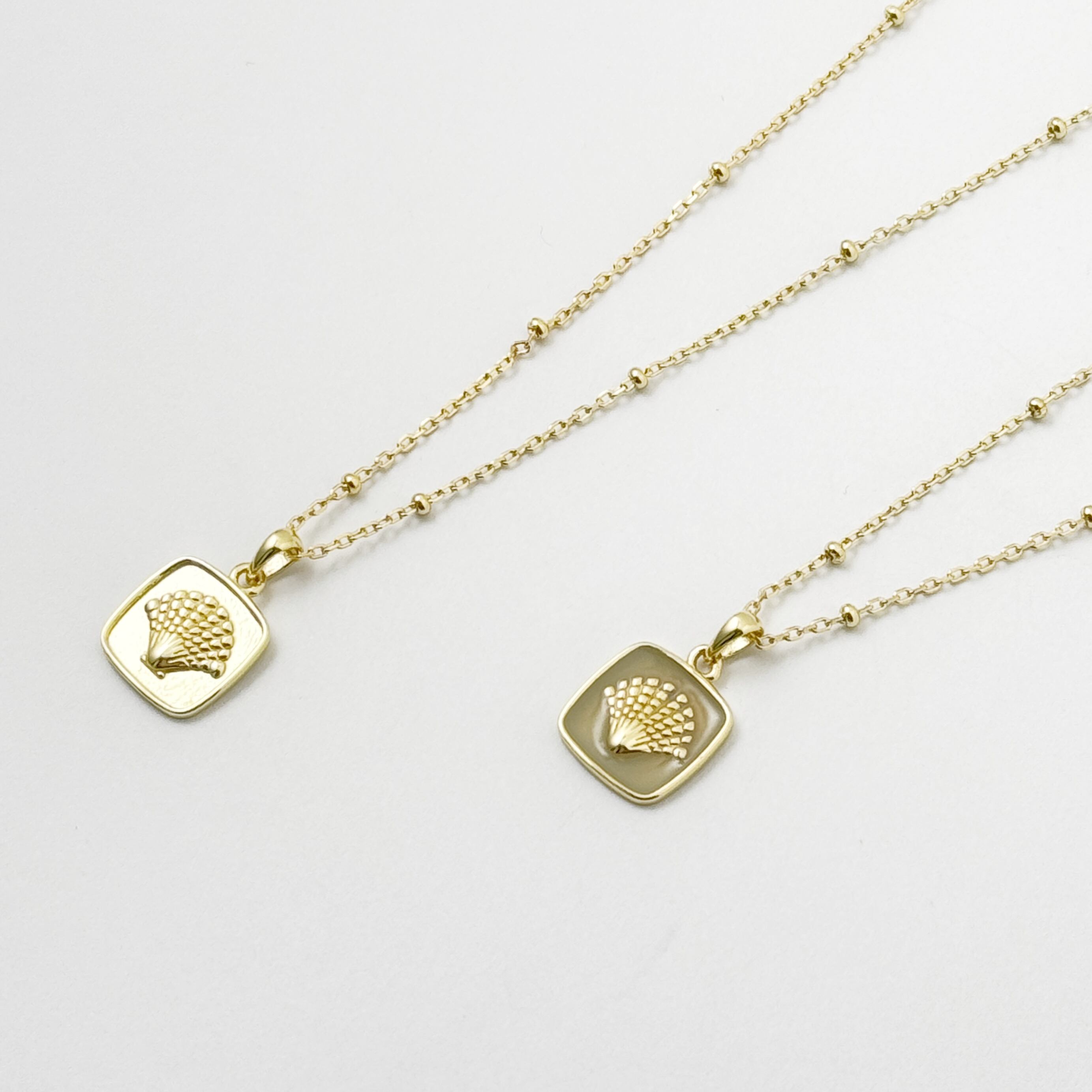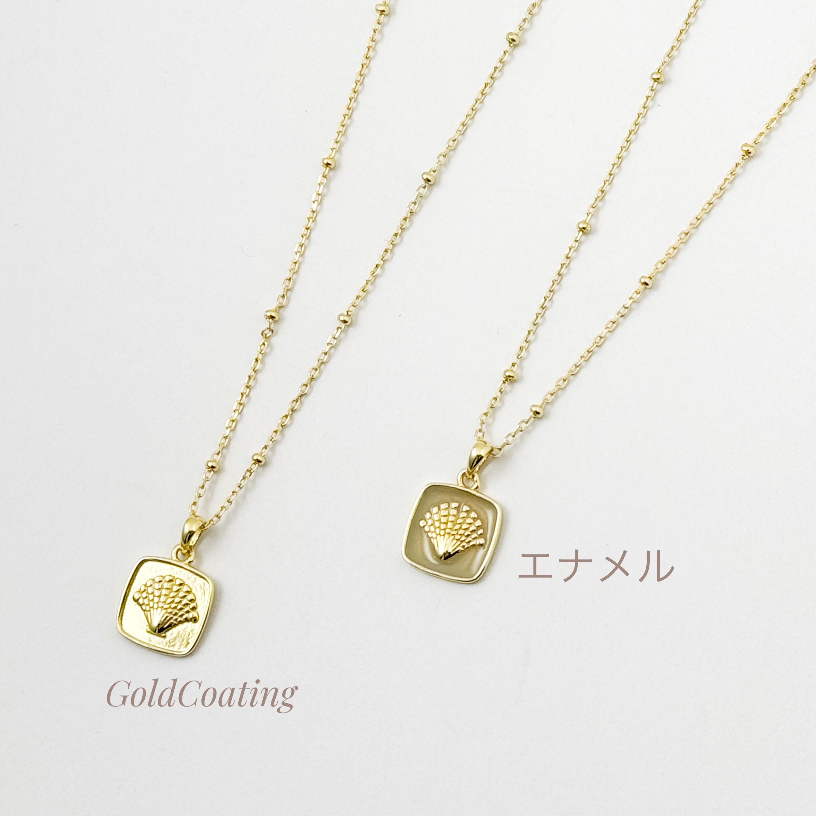 Gold Coatingを施したスクエア型のプレートからクラシックなシェルが浮き上がる美しいネックレスです。