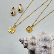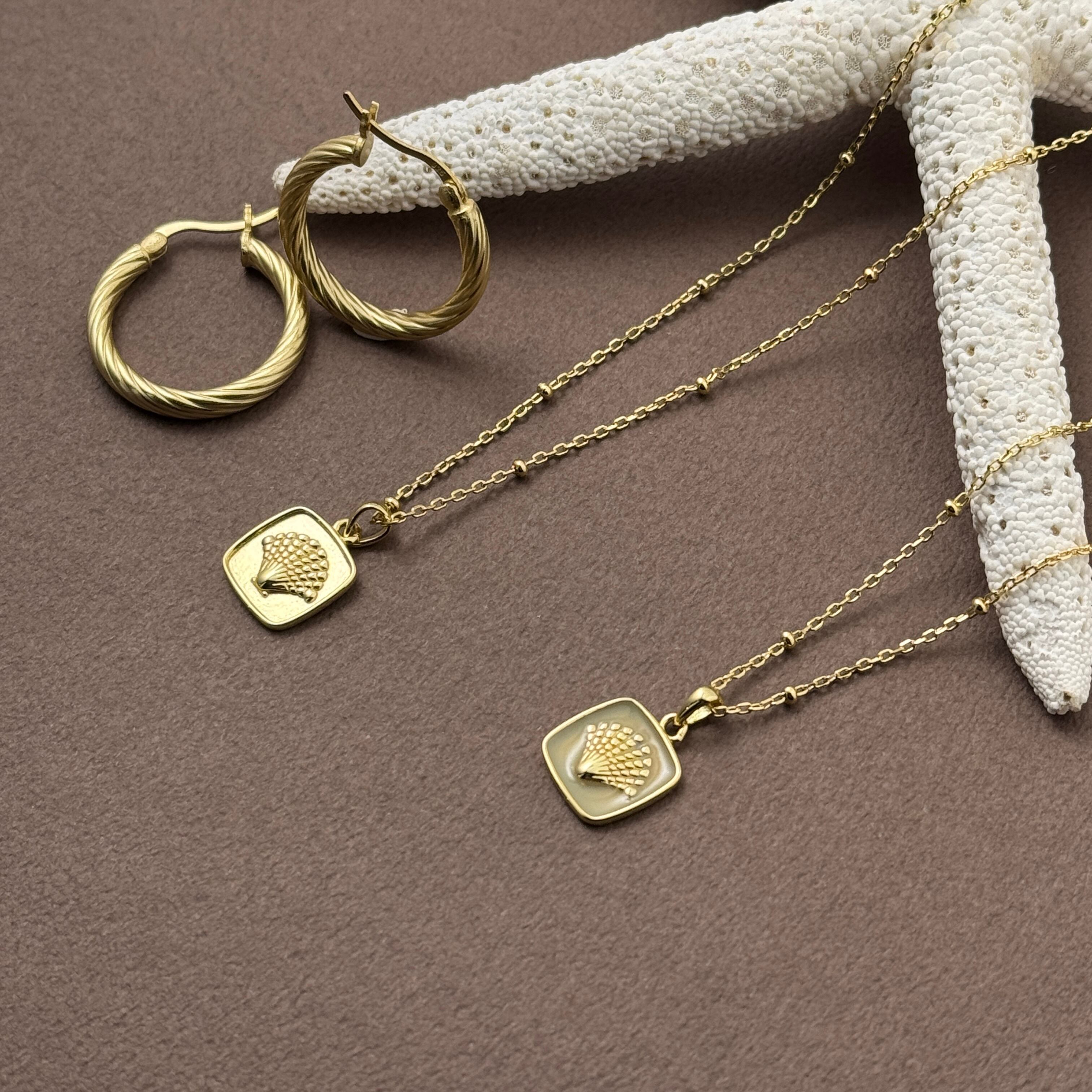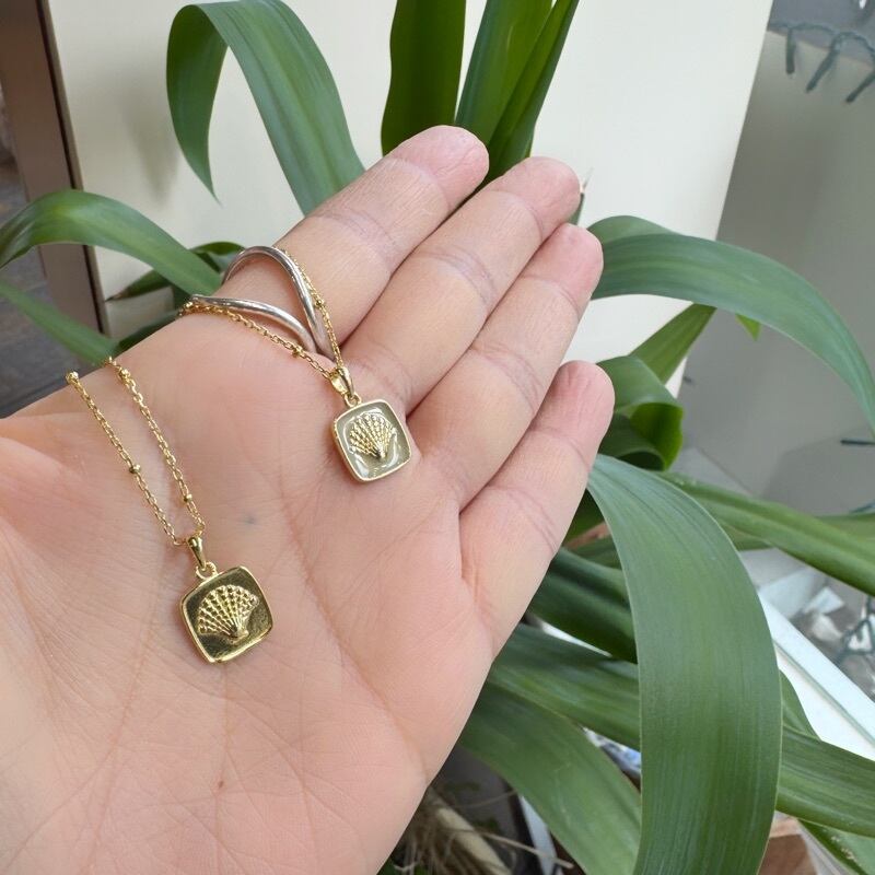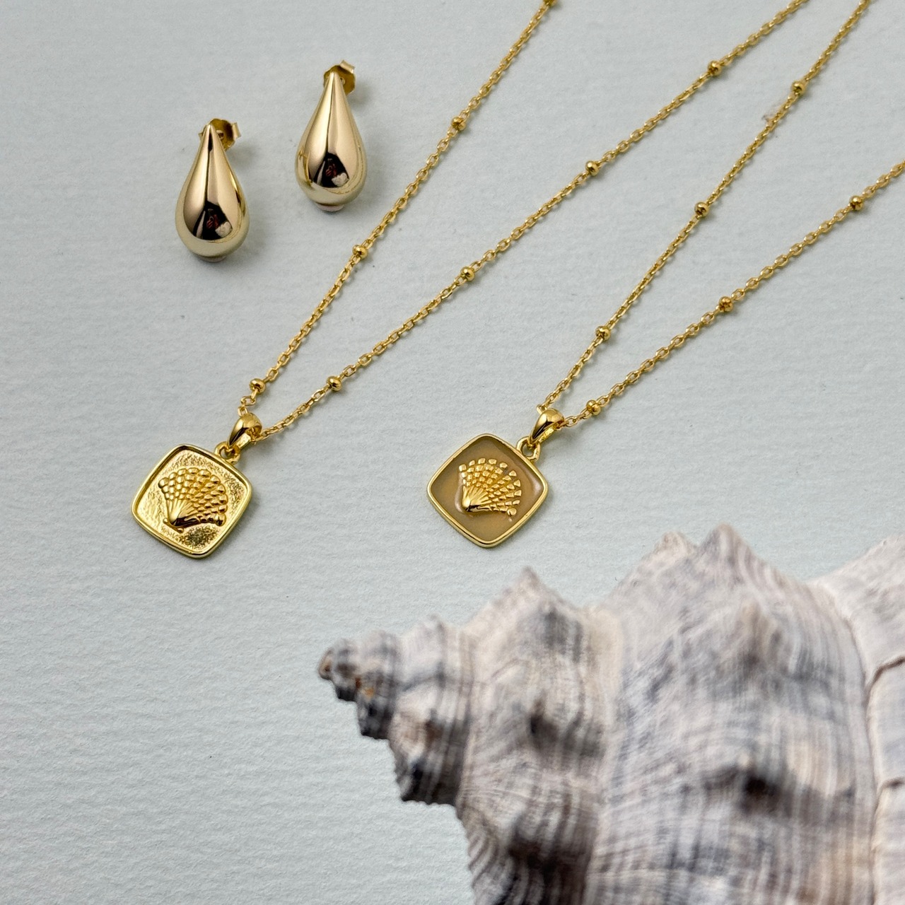 Gold Coatingを施したスクエア型のプレートからクラシックなシェルが浮き上がる美しいネックレスです。