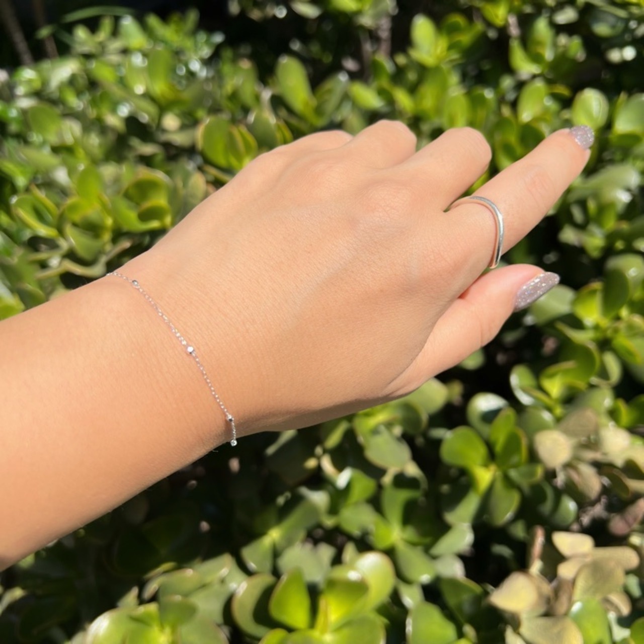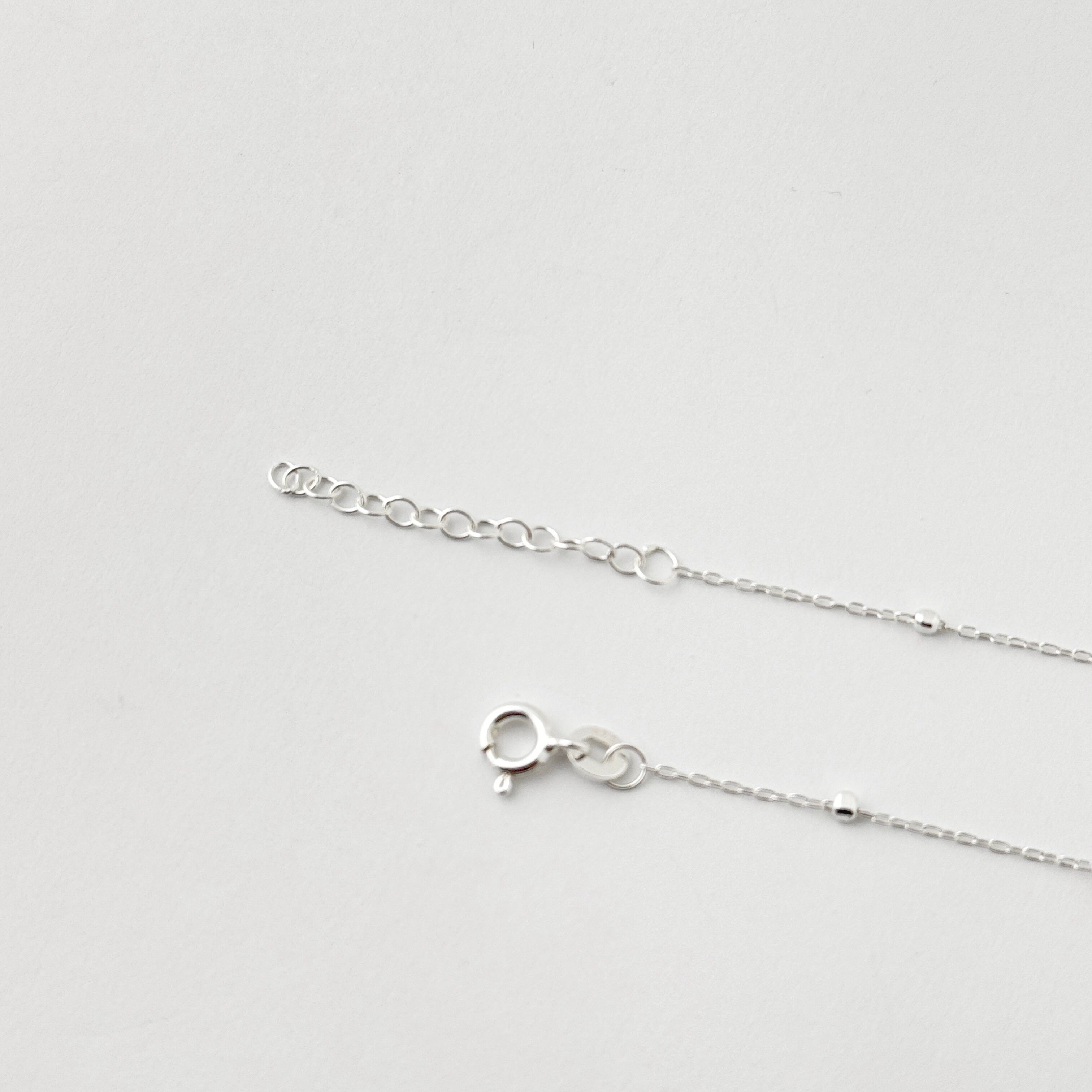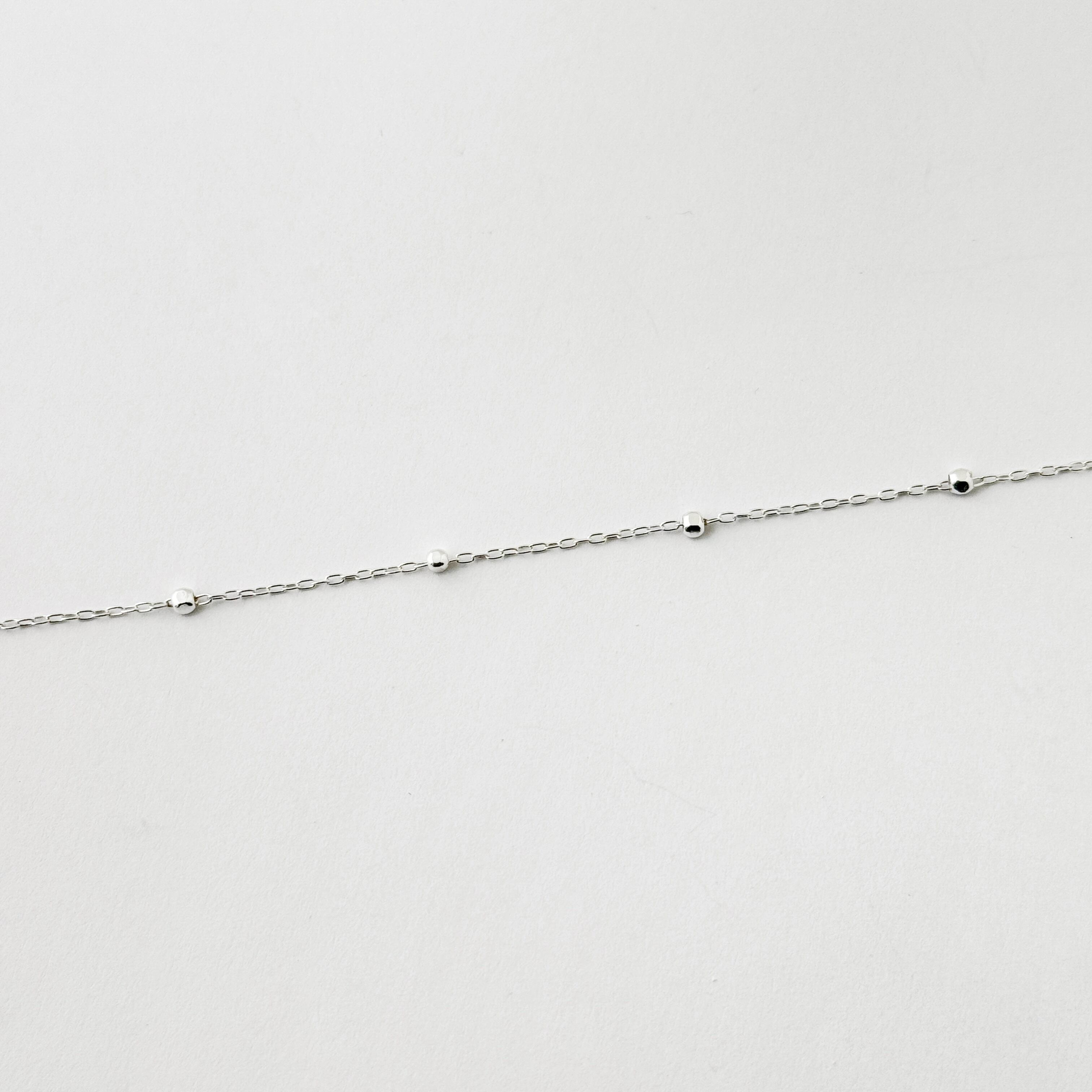オールシルバーの華奢なチェーンに等間隔にカドの取れたスクエアドットの玉がついたブレスレットです。