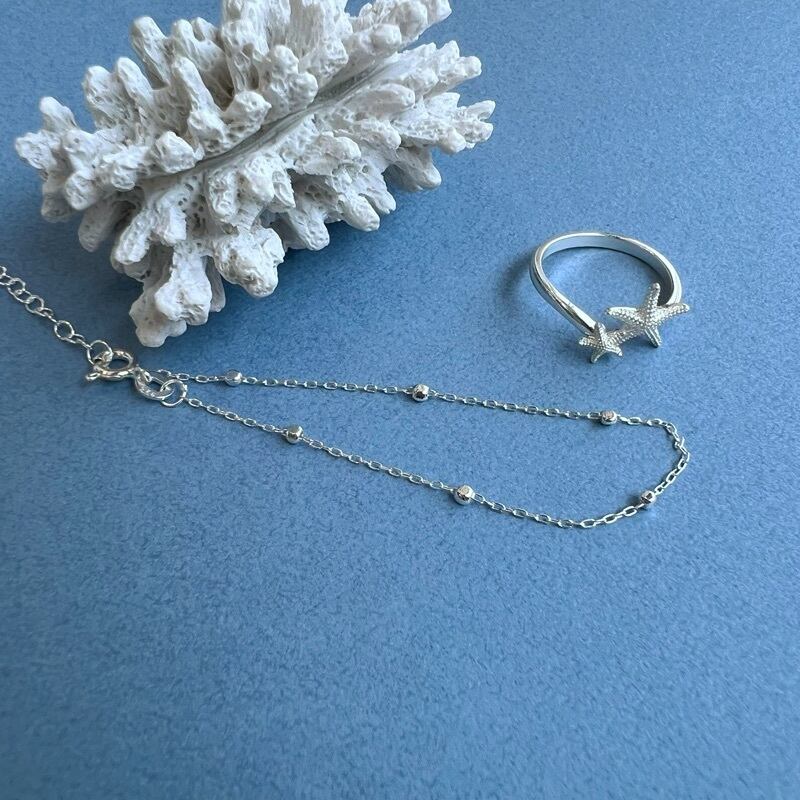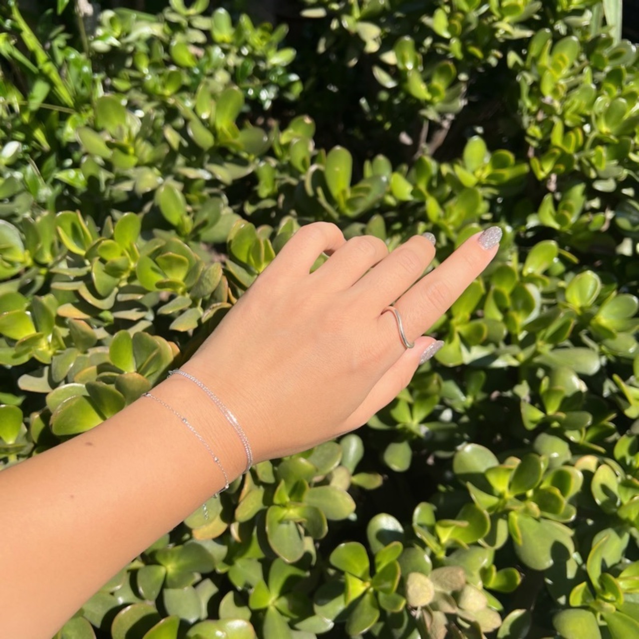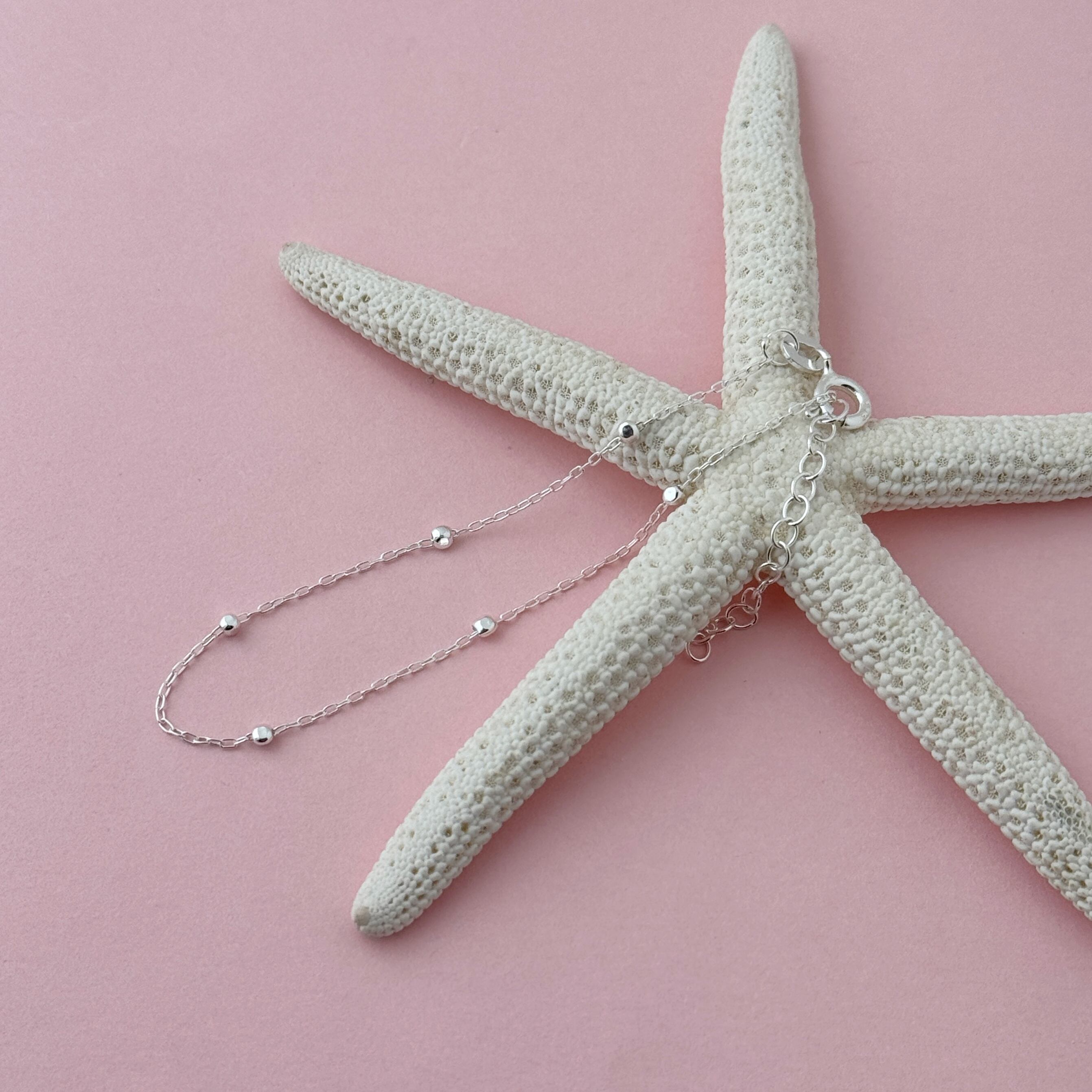 オールシルバーの華奢なチェーンに等間隔にカドの取れたスクエアドットの玉がついたブレスレットです。