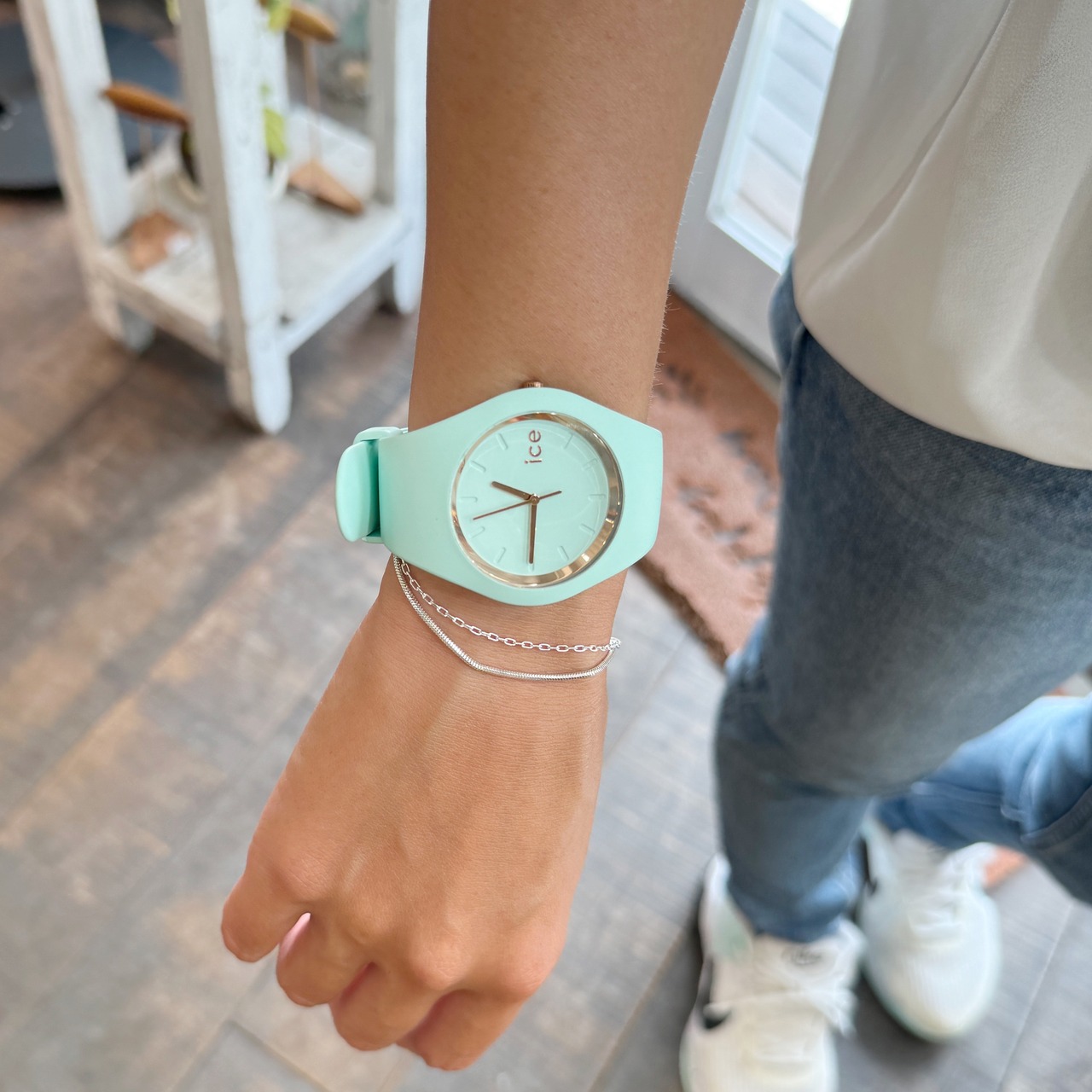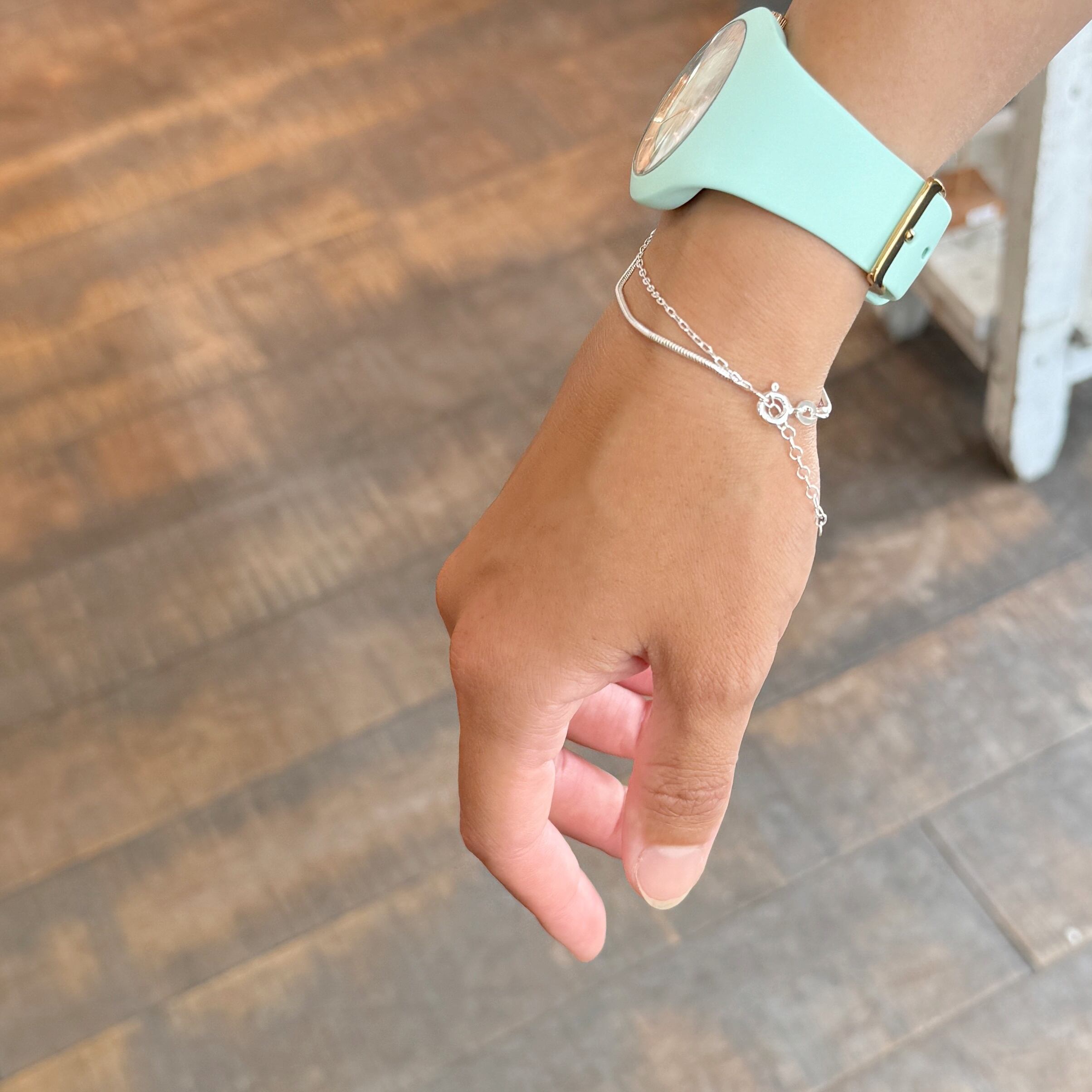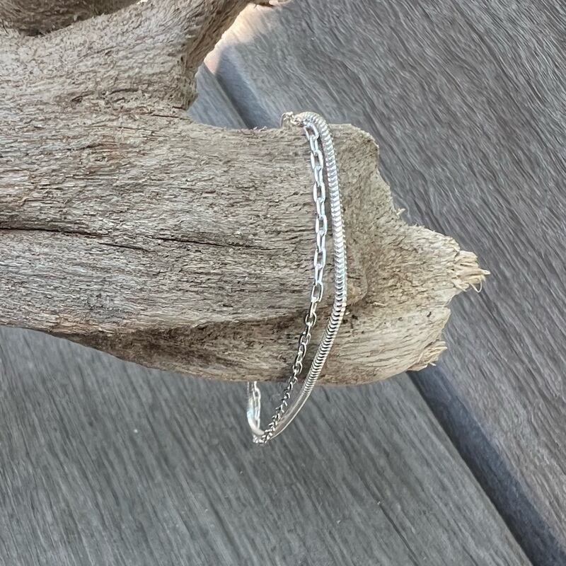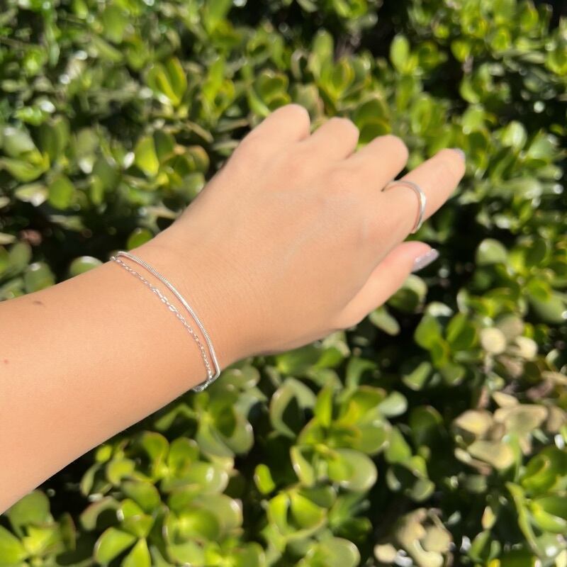 1つのブレスレットなのに2本デザイン違いのチェーンのついたダブルチェーンブレスレット。