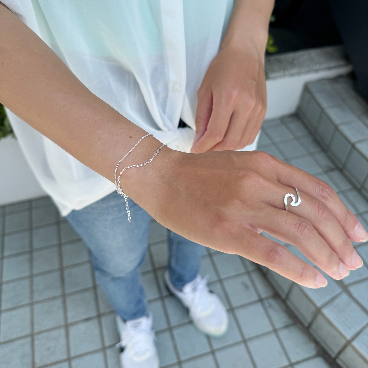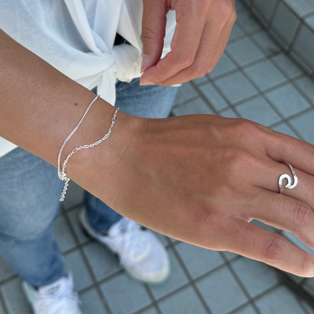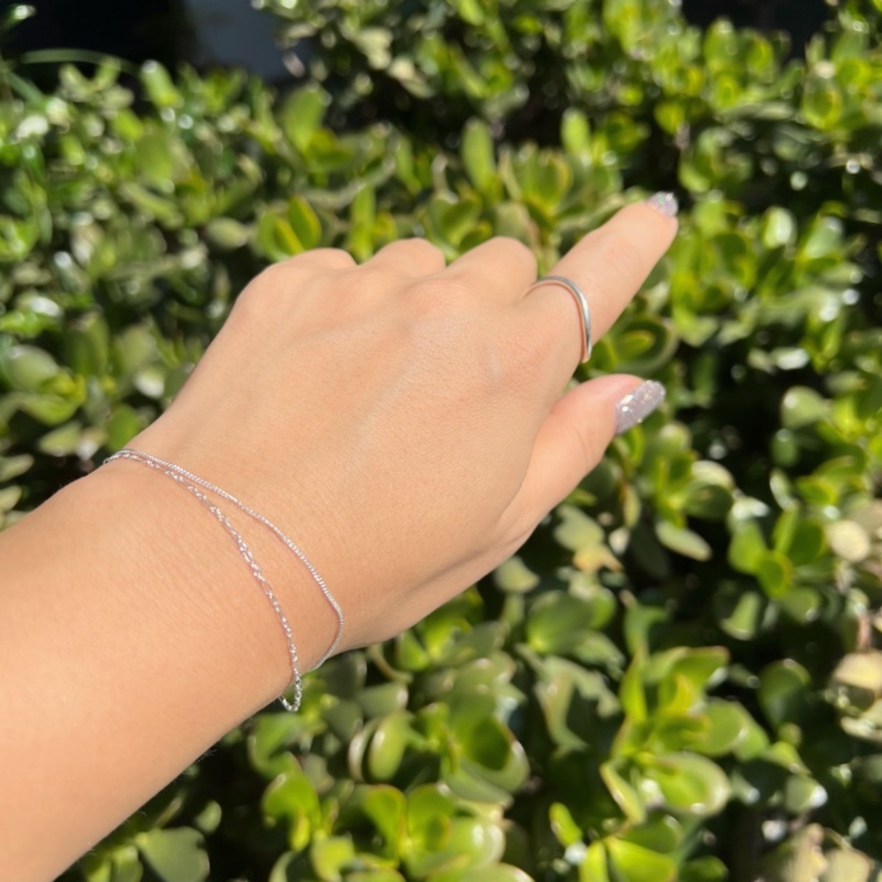 1つのブレスレットなのに2本デザイン違いのチェーンのついたダブルチェーンブレスレット。