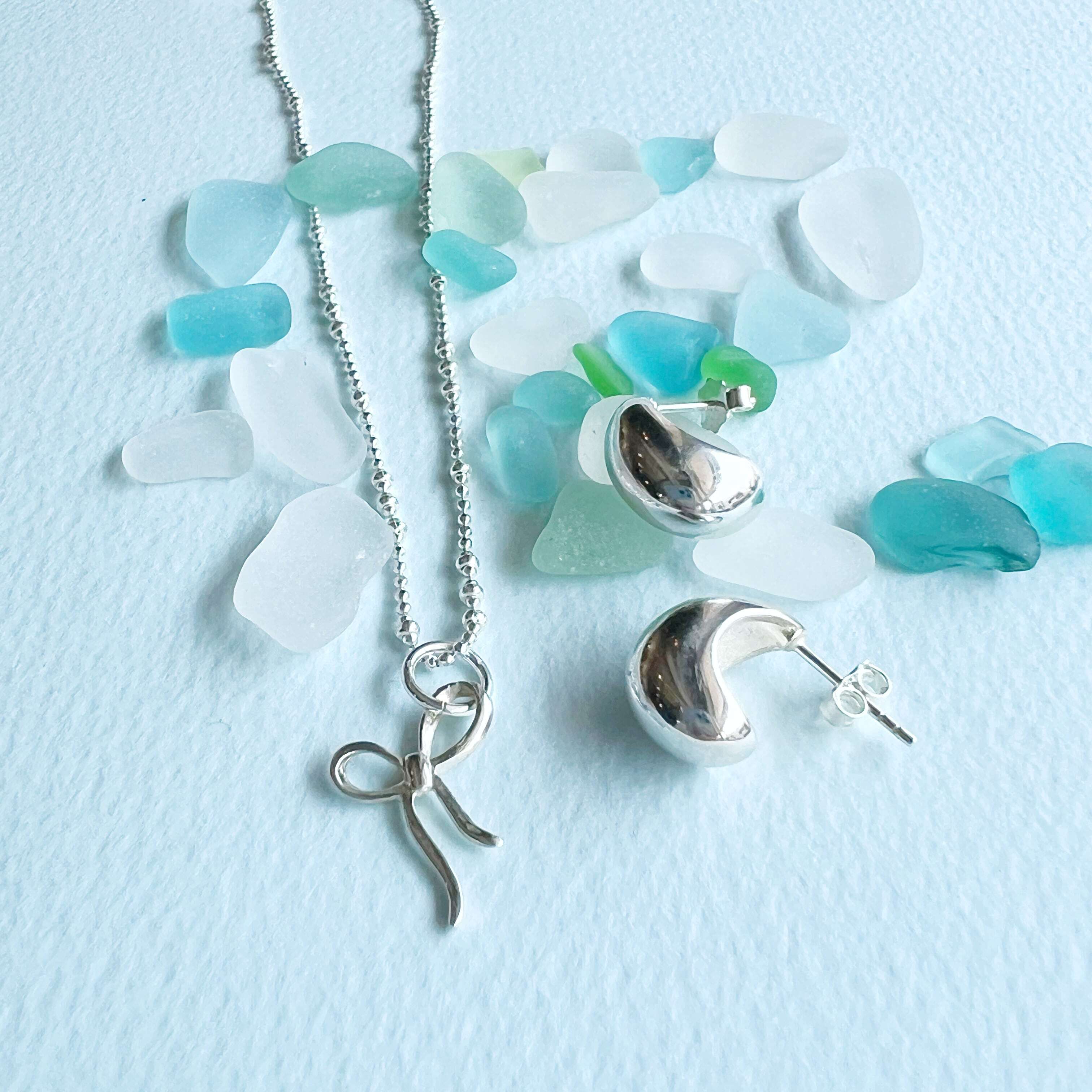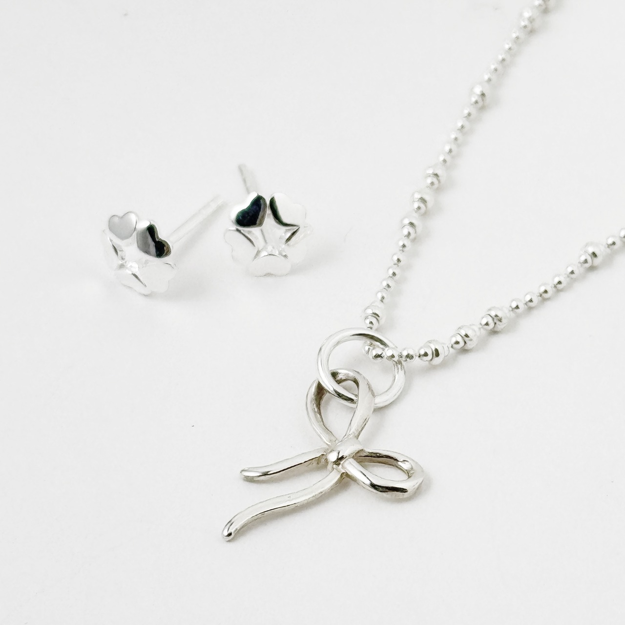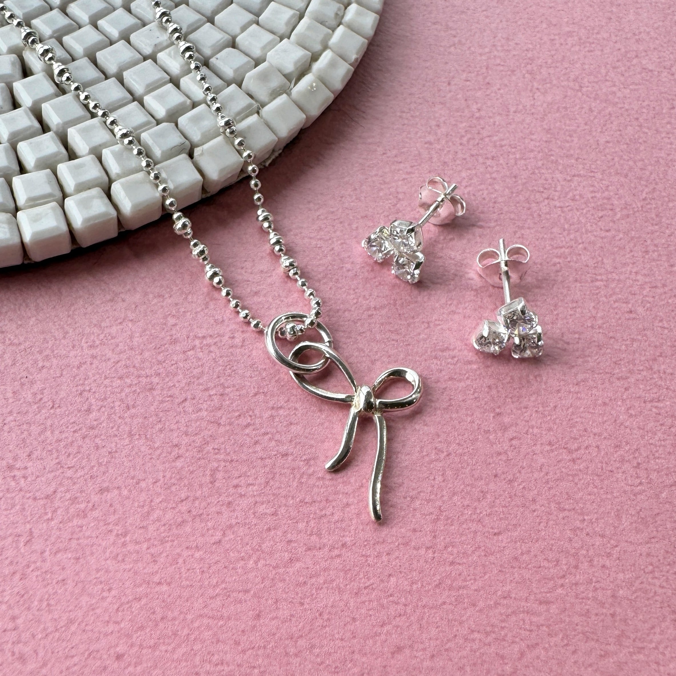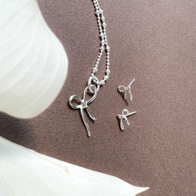 リボンの形が女性らしさを演出しカッボールチェーンが上品な輝きをプラスしてくれます。