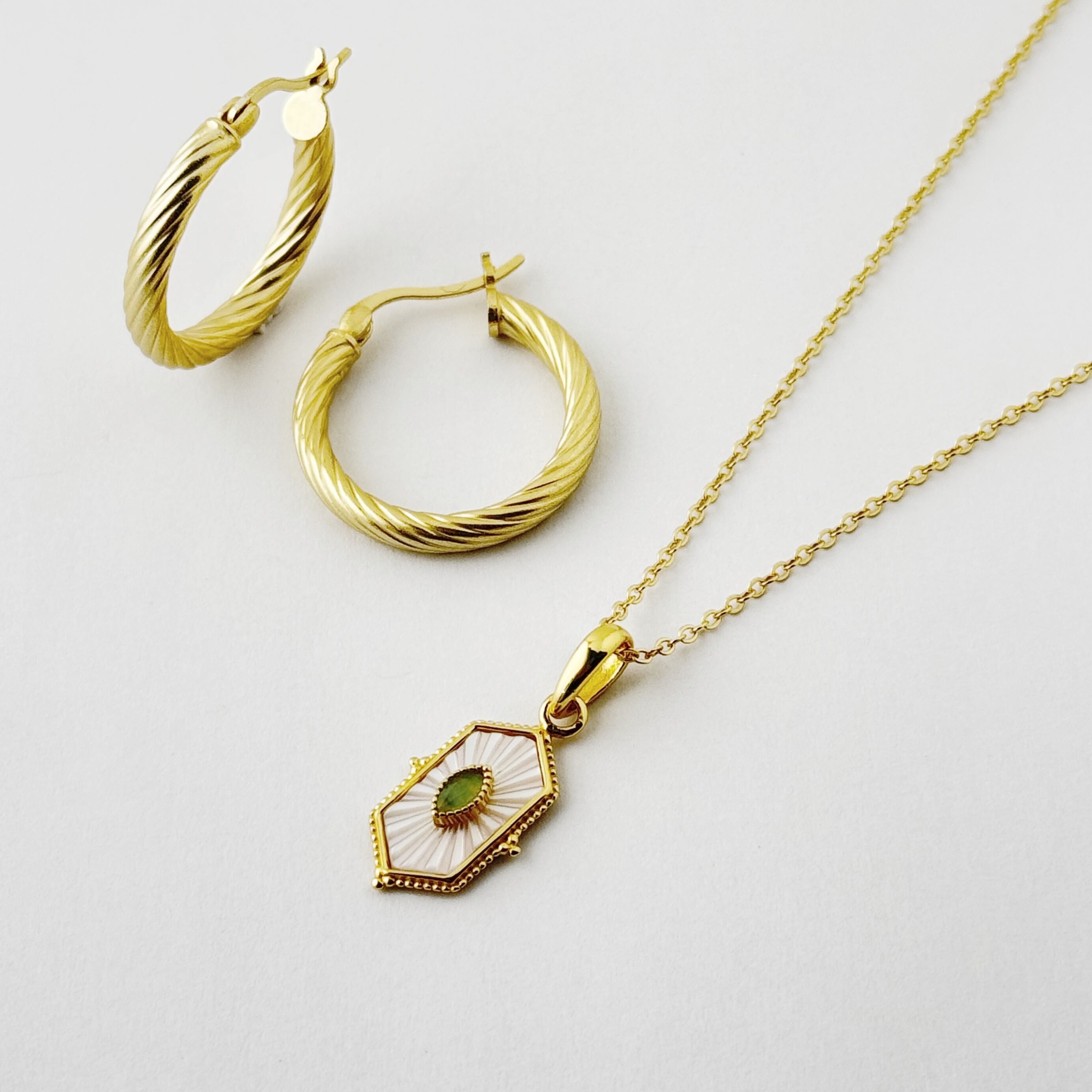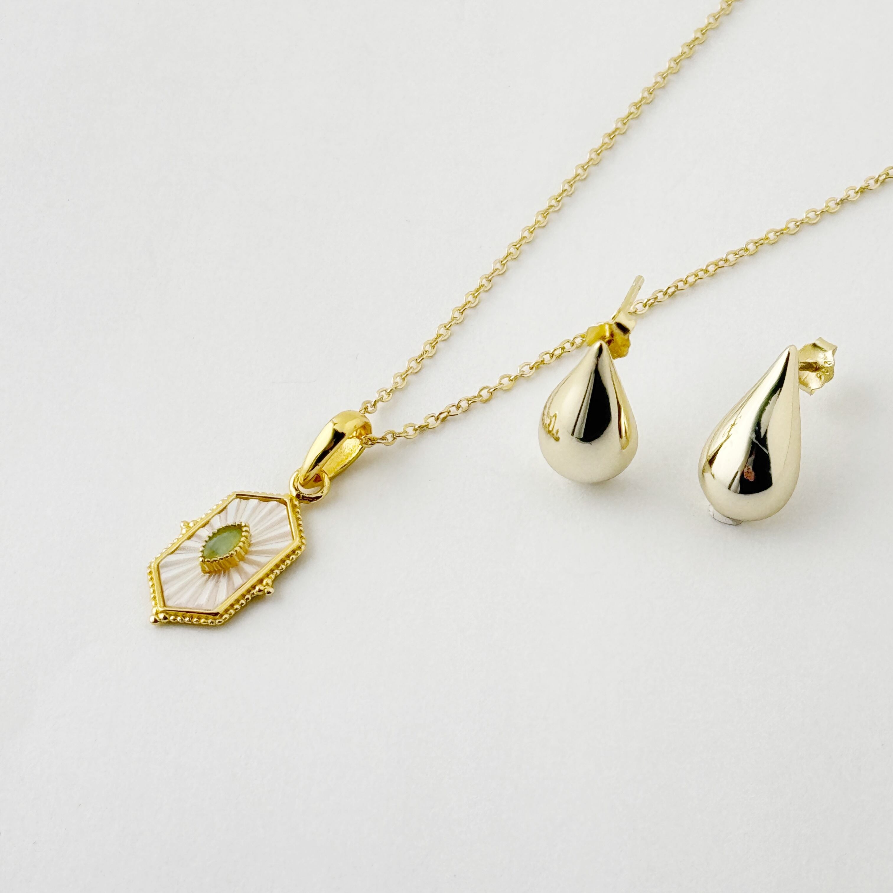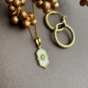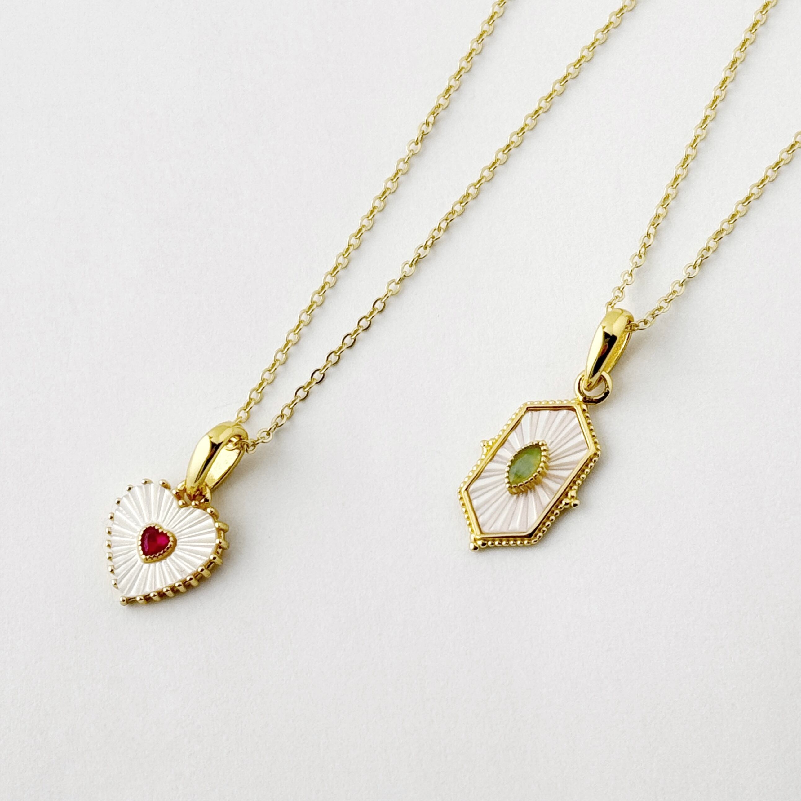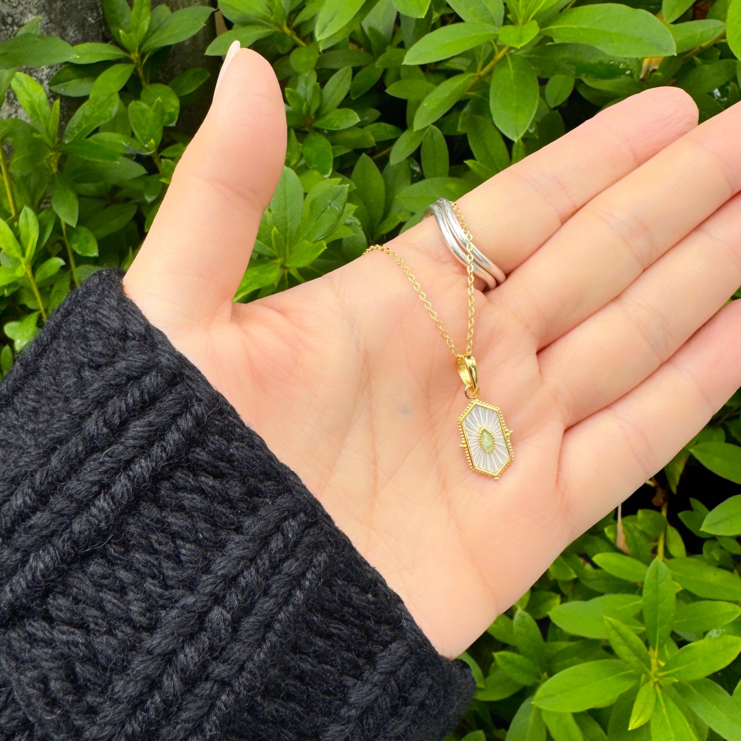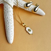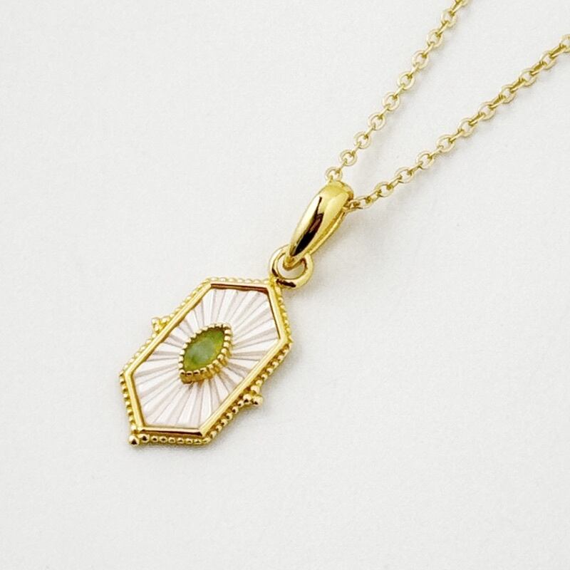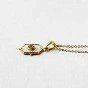 ちょっとレトロなデザインのペリドットと白蝶貝が施されたGold Coatingのネックレスです。