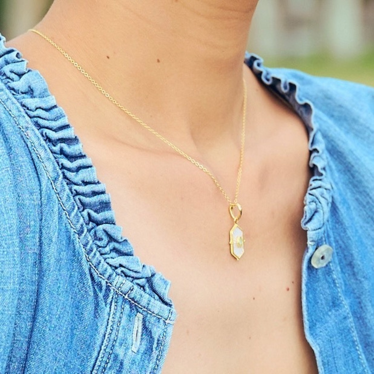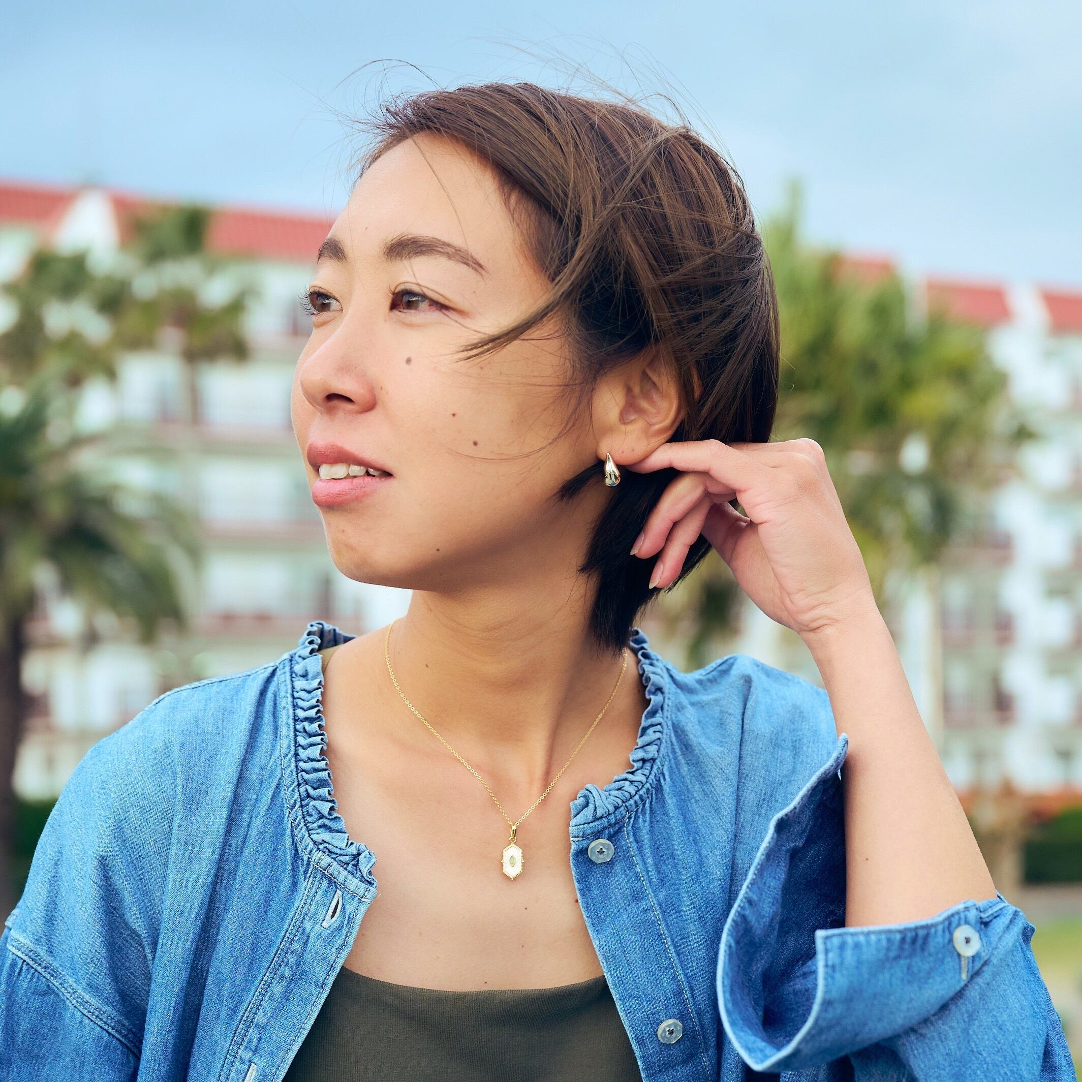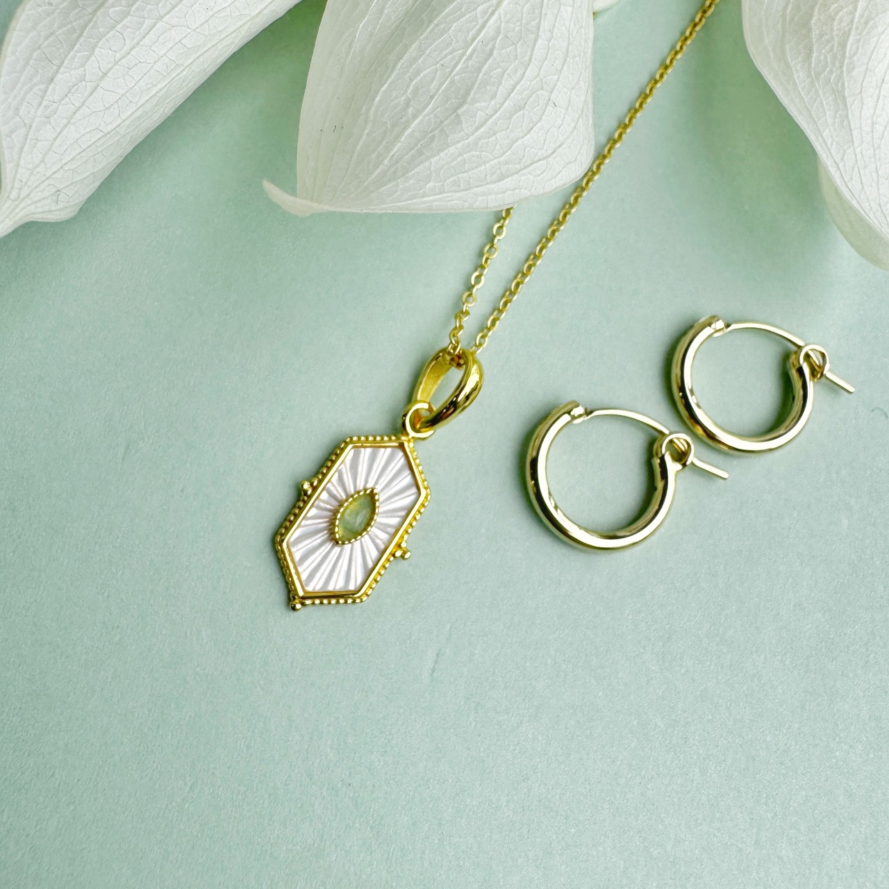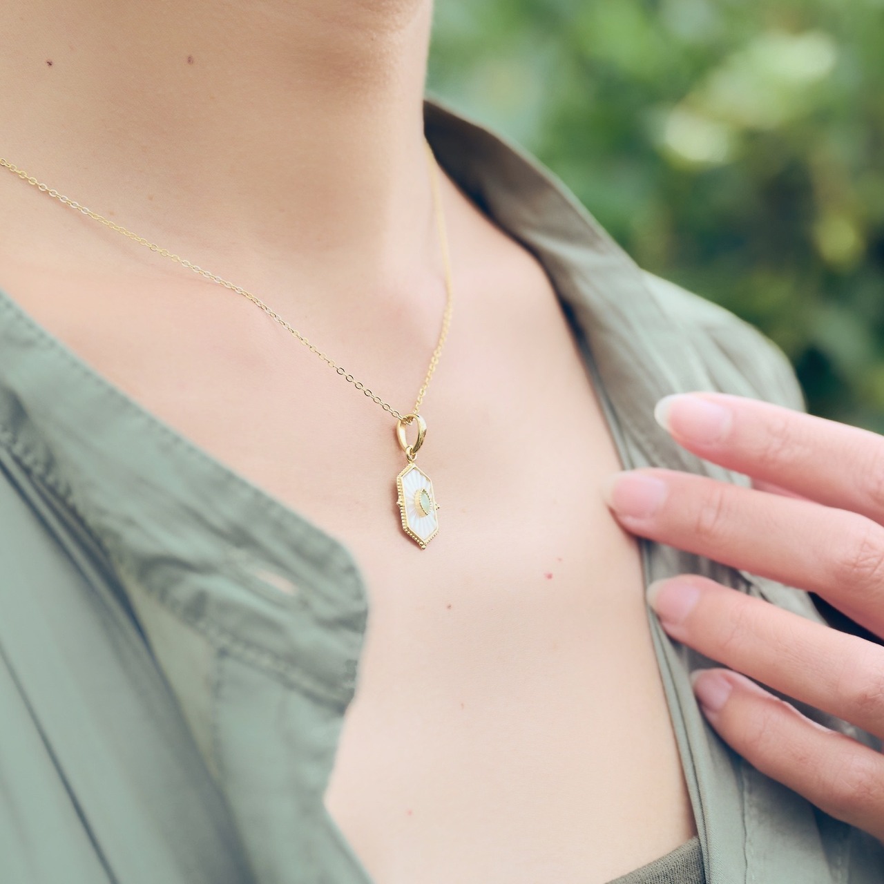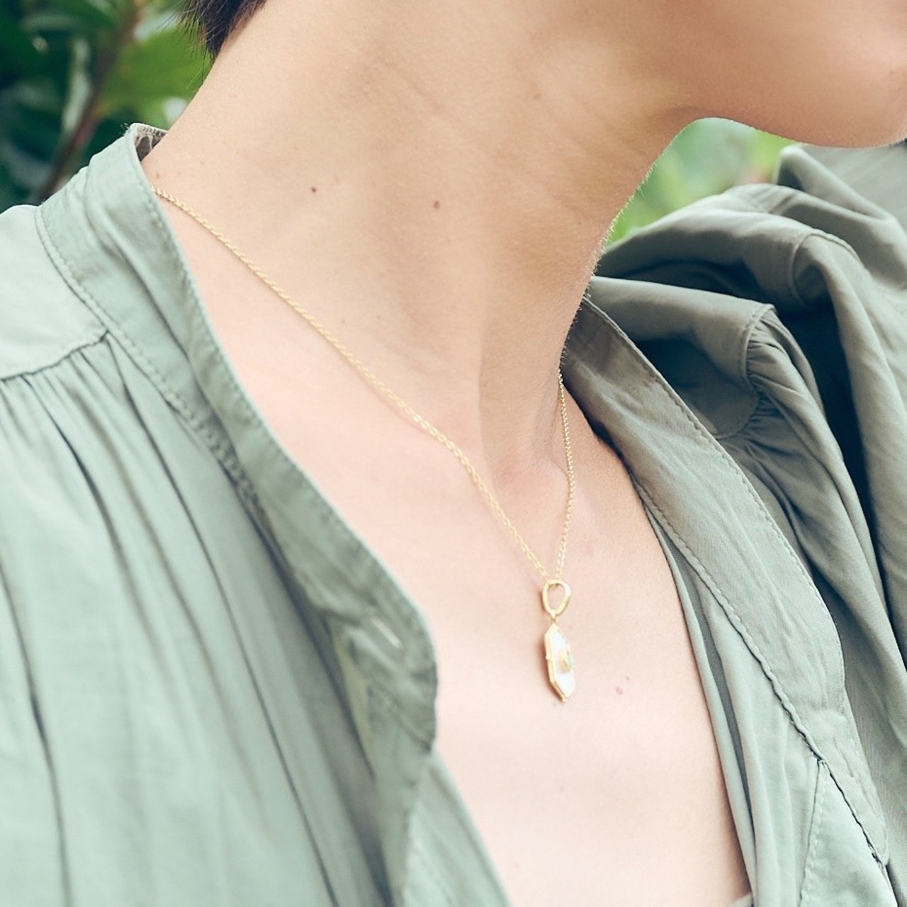 ちょっとレトロなデザインのペリドットと白蝶貝が施されたGold Coatingのネックレスです。