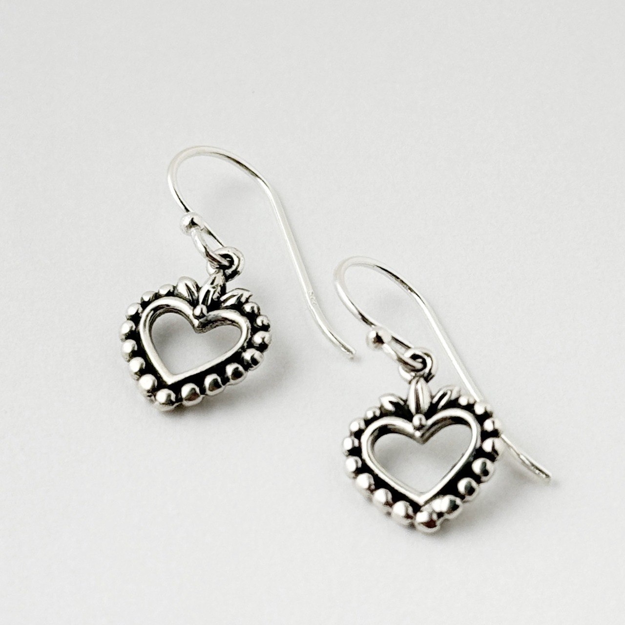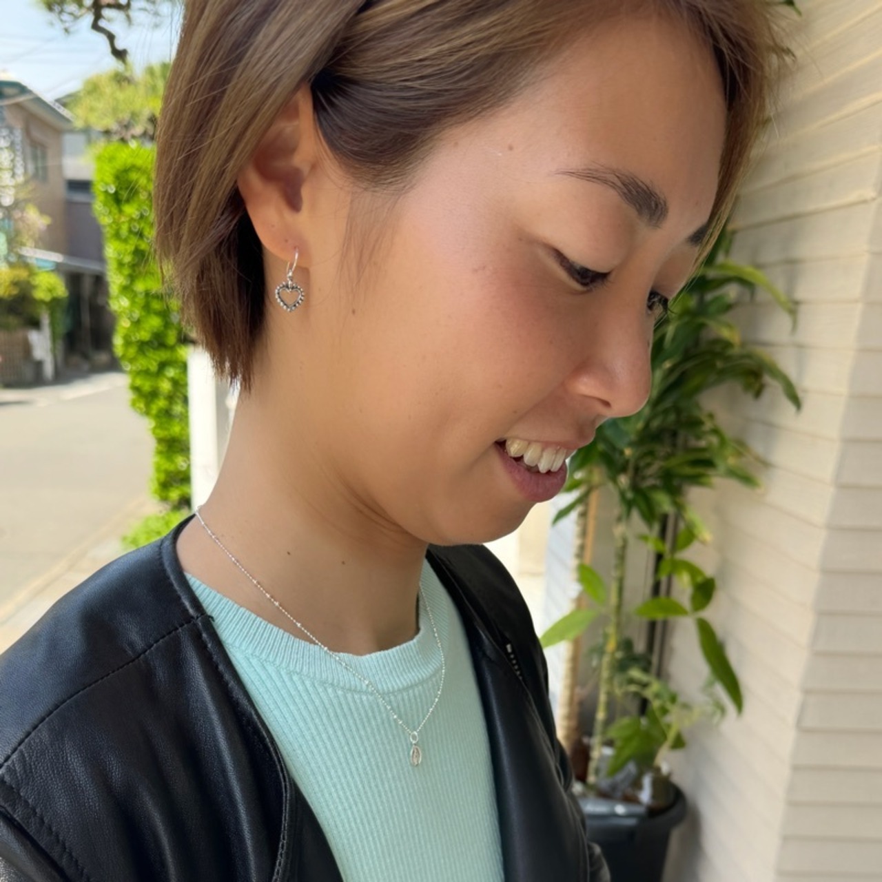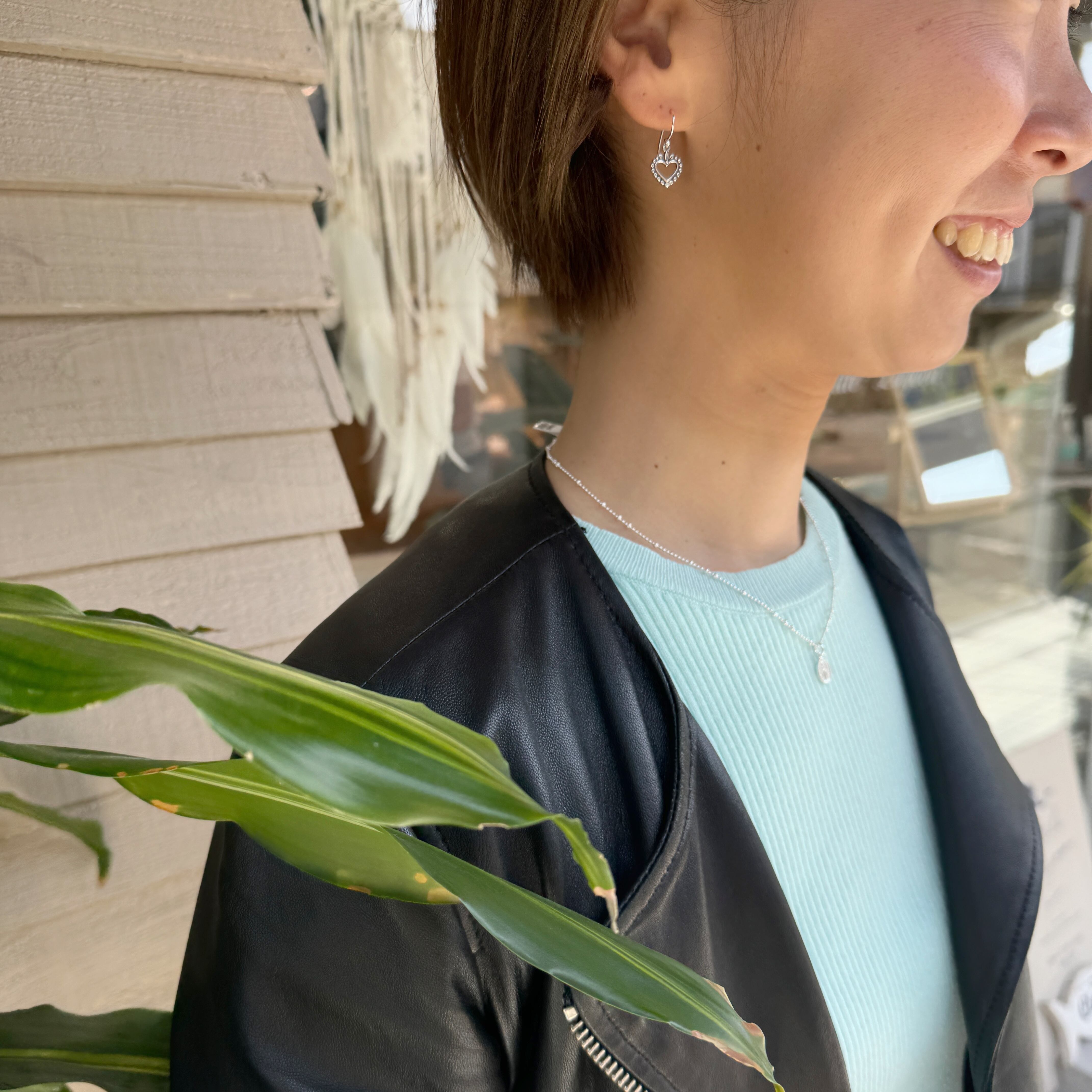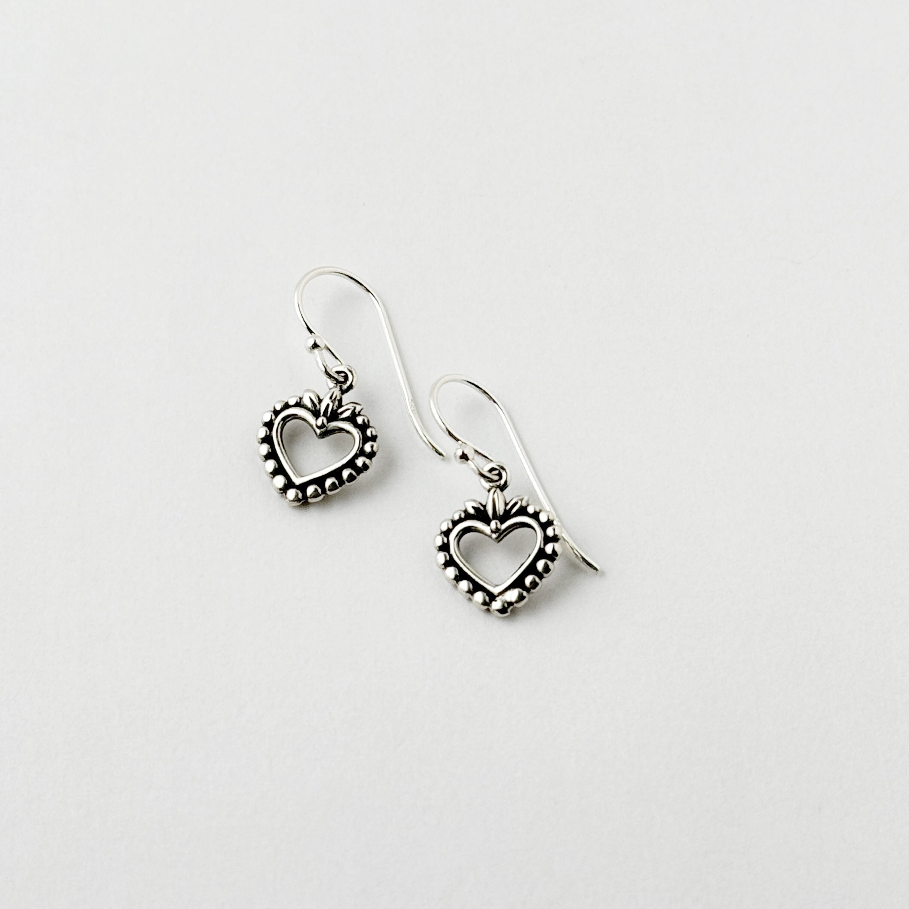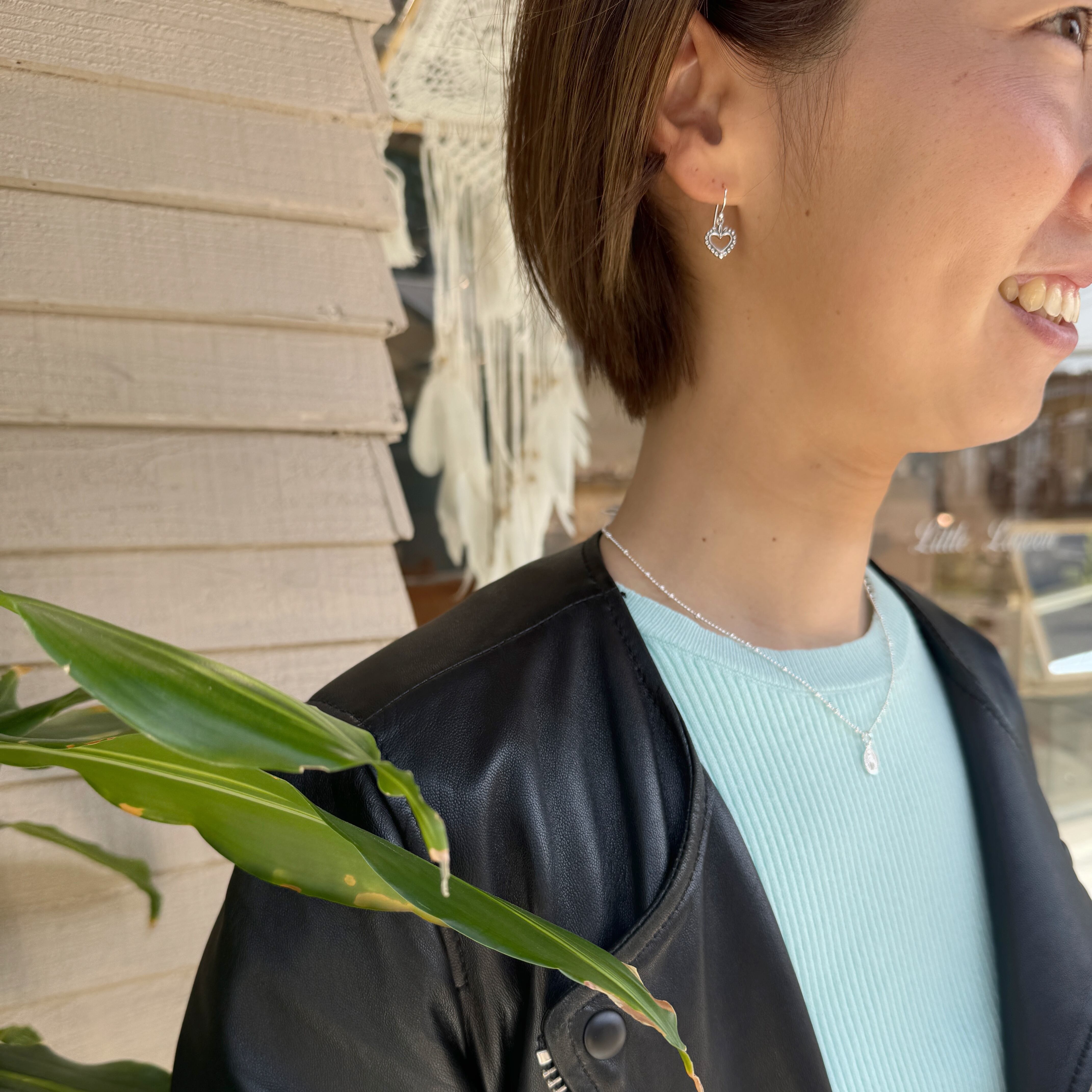 くり抜かれたハートの周りにドットで囲み、さらにオキシダイズドされた可愛いハートがちょっとクールにも見えるフックピアスです。